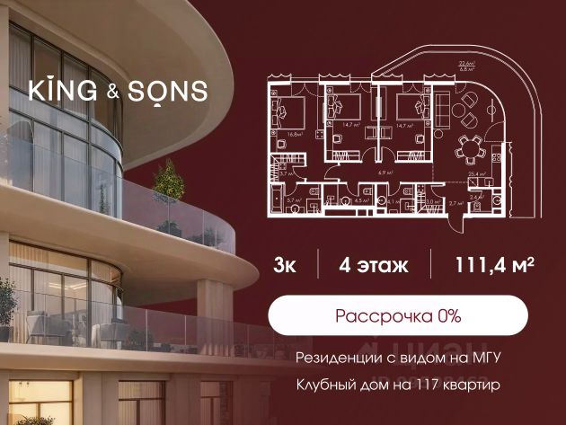 Функциональная планировка включает гостиную, кухню-столовую, 2 спальни со своими санузлами и гардеробными, кабинет, гостевой санузел, 4 лоджии и прихожую с гардеробной. Окна, ориентированные на две стороны света, открывают виды на территорию комплекса. За дополнительную плату возможно приобрести 2 машино-места в подземном паркинге.