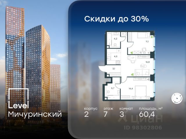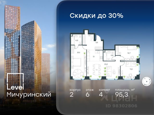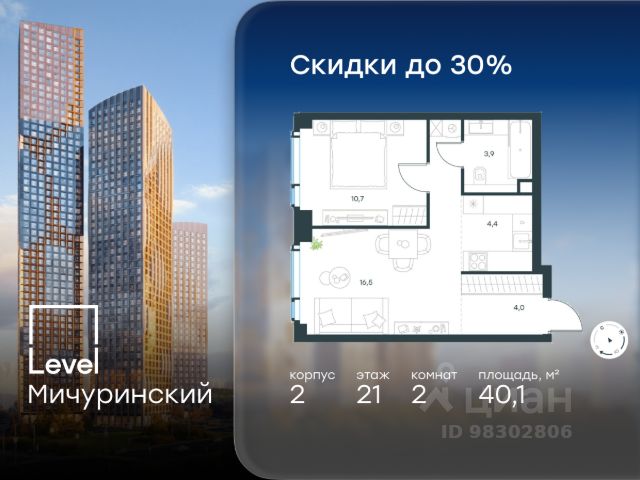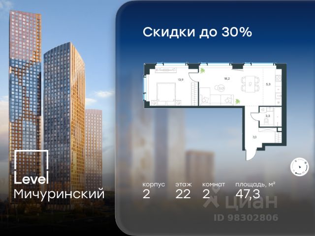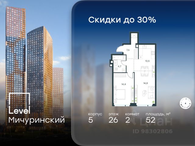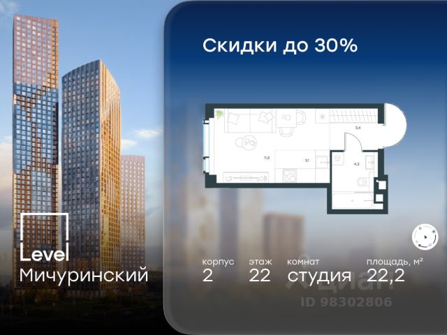 Цена указана с учётом скидки при 100%-й оплате, несубсидированной ипотеке, рассрочке (кроме программы "Рассрочка 0%"). В жилом квартале, расположенном на границе с природным заказником "Долина реки Очаковки", продаётся студия площадью 22.20 кв.м без отделки. Квартира расположена на 22 этаже 42-этажного корпуса 2 в жилом комплексе бизнес-класса Level Мичуринский (компания Level Group/Левел групп). Отличная транспортная доступность - 10 мин. пешком до станции метро "Мичуринский проспект" - 15 мин. пешком до станции метро "Аминьевская" - 7 мин. на авто до МКАД - 10 мин. на авто до ТТК - 15 мин. на авто до Москва-Сити Продуманный архитектурный проект - Выразительная архитектура от известных бюро: корпуса 1-6 - СПИЧ, корпуса 7-13 - Borisov Architects; - Из окон открываются живописные виды на парки, Москва-Сити и МГУ; - Высокие потолки до 6,35 м; - Стильные лобби с окнами в пол и высокими потолками до 4,7 м; - С каждого этажа дома на лифте можно спуститься в подземный отапливаемый паркинг. Расположение Level Мичуринский строится в одном из самых зелёных районов Москвы - Очаково-Матвеевское. Этот уголок столицы идеален для поддержания здорового образа жизни. В шаговой доступности от проекта находятся заказник "Долина реки Очаковки" - 1 мин. пешком и Очаковский парк - 7 мин. пешком. На велосипеде можно добраться до таких парков, как "Событие", парк Олимпийской деревни, парк 50-летия Октября и парк Школьников. В 15 минутах езды на авто расположено более 30 детских садов (из них 14 в пешей доступности), 32 школы (из них 13 в пешей доступности) и 14 вузов. Также в ближайшем окружении - более 25 медицинских учреждений, 11 спортивных клубов и 22 продуктовых супермаркета. Внутренняя инфраструктура На территории жилого комплекса строится три детских сада и школа. На первых этажах домов откроется супермаркет, фитнес-центр, ресторан, кафе и другие сервисы. Подземные этажи займут паркинги: трёхуровневые - в этапах 1 и 2, одноуровневый - в этапах 3 и 4. Преимущества проекта - 4,5 га благоустроенной территории с видовым мостом, уличным кинотеатром, зонами для тихого отдыха, работы, воркаута, площадки для петанка, футбола, настольного тенниса и пляжного волейбола. - Дизайнерские лобби с панорамным видом на двор, мойками для лап животных и комфортными зонами ожидания. - Безопасность жителей: круглосуточное видеонаблюдение всех зон общего пользования (лобби, лифты, паркинги, детские площадки), система контроля доступа, управление видеодомофоном через мобильное приложение, единый ключ доступа на территорию жилого комплекса. - Технологии и комфорт: высокоскоростной Wi-Fi в лобби и на придомовой территории, автоматическая система контроля и учёта ресурсов, абонентская связь с консьержем, распознавание номеров автомобилей при въезде в паркинг и выезде из него. Купить квартиру на улице Озерная в Москве.