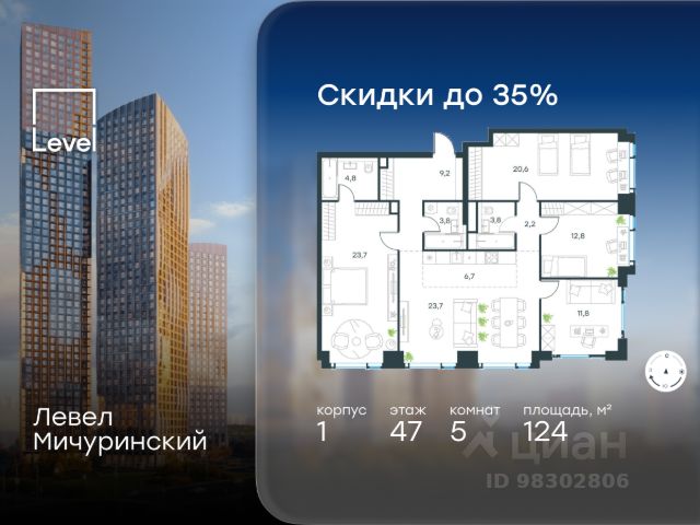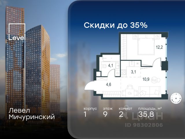 Цена указана с учётом скидки при 100%-й оплате, несубсидированной ипотеке, рассрочке (кроме программы "Рассрочка 0%"). В жилом квартале, расположенном на границе с природным заказником "Долина реки Очаковки", продаётся 2-комнатная квартира площадью 35.80 кв.м без отделки. Квартира расположена на 9 этаже 54-этажного корпуса 1 в жилом комплексе бизнес-класса Левел Мичуринский (компания Level Group/Левел групп). Отличная транспортная доступность: - от 10 мин. пешком до станции метро "Мичуринский проспект" - 15 мин. пешком до станции метро "Аминьевская" - 7 мин. на авто до МКАД - 10 мин. на авто до ТТК - 15 мин. на авто до Москва-Сити Продуманный архитектурный проект: - Выразительная архитектура от известных бюро: корпуса 1-6 - СПИЧ, корпуса 7-13 - Borisov Architects; - Из окон открываются живописные виды на парки, Москва-Сити и МГУ; - Высокие потолки до 6,35 м; - Стильные лобби с окнами в пол и высокими потолками до 4,7 м; - С каждого этажа дома на лифте можно спуститься в подземный отапливаемый паркинг. Расположение: Жилой комплекс Левел Мичуринский строится в одном из самых зелёных районов Москвы - Очаково-Матвеевское. Этот уголок столицы идеален для поддержания здорового образа жизни. В шаговой доступности от проекта находятся заказник "Долина реки Очаковки" - 1 мин. пешком и Очаковский парк - 7 мин. пешком. На велосипеде можно добраться до таких парков, как "Событие", парк Олимпийской деревни, парк 50-летия Октября и парк Школьников. В 15 минутах езды на авто расположено более 30 детских садов (из них 14 в пешей доступности), 32 школы (из них 13 в пешей доступности) и 14 вузов. Также в ближайшем окружении - более 25 медицинских учреждений, 11 спортивных клубов и 22 продуктовых супермаркета. Внутренняя инфраструктура: На территории жилого комплекса строится три детских сада и школа. На первых этажах домов откроется супермаркет, фитнес-центр, ресторан, кафе и другие сервисы. Подземные этажи займут паркинги: трёхуровневые - в этапах 1 и 2, одноуровневый - в этапах 3 и 4. Преимущества проекта: - 4,5 га благоустроенной территории с видовым мостом, уличным кинотеатром, зонами для тихого отдыха, работы, воркаута, площадки для петанка, футбола, настольного тенниса и пляжного волейбола. - Дизайнерские лобби с панорамным видом на двор, мойками для лап животных и комфортными зонами ожидания. - Безопасность жителей: круглосуточное видеонаблюдение всех зон общего пользования (лобби, лифты, паркинги, детские площадки), система контроля доступа, управление видеодомофоном через мобильное приложение, единый ключ доступа на территорию жилого комплекса. - Технологии и комфорт: высокоскоростной Wi-Fi в лобби и на придомовой территории, автоматическая система контроля и учёта ресурсов, абонентская связь с консьержем, распознавание номеров автомобилей при въезде в паркинг и выезде из него.