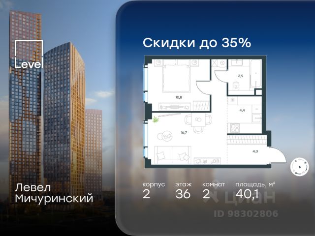 Цена указана с учётом скидки при 100%-й оплате, несубсидированной ипотеке, рассрочке (кроме программы "Рассрочка 0%"). В жилом квартале, расположенном на границе с природным заказником "Долина реки Очаковки", продаётся 2-комнатная квартира площадью 40.10 кв.м без отделки. Квартира расположена на 36 этаже 42-этажного корпуса 2 в жилом комплексе бизнес-класса Левел Мичуринский (компания Level Group/Левел групп). Отличная транспортная доступность: - от 10 мин. пешком до станции метро "Мичуринский проспект" - 15 мин. пешком до станции метро "Аминьевская" - 7 мин. на авто до МКАД - 10 мин. на авто до ТТК - 15 мин. на авто до Москва-Сити Продуманный архитектурный проект: - Выразительная архитектура от известных бюро: корпуса 1-6 - СПИЧ, корпуса 7-13 - Borisov Architects; - Из окон открываются живописные виды на парки, Москва-Сити и МГУ; - Высокие потолки до 6,35 м; - Стильные лобби с окнами в пол и высокими потолками до 4,7 м; - С каждого этажа дома на лифте можно спуститься в подземный отапливаемый паркинг. Расположение: Жилой комплекс Левел Мичуринский строится в одном из самых зелёных районов Москвы - Очаково-Матвеевское. Этот уголок столицы идеален для поддержания здорового образа жизни. В шаговой доступности от проекта находятся заказник "Долина реки Очаковки" - 1 мин. пешком и Очаковский парк - 7 мин. пешком. На велосипеде можно добраться до таких парков, как "Событие", парк Олимпийской деревни, парк 50-летия Октября и парк Школьников. В 15 минутах езды на авто расположено более 30 детских садов (из них 14 в пешей доступности), 32 школы (из них 13 в пешей доступности) и 14 вузов. Также в ближайшем окружении - более 25 медицинских учреждений, 11 спортивных клубов и 22 продуктовых супермаркета. Внутренняя инфраструктура: На территории жилого комплекса строится три детских сада и школа. На первых этажах домов откроется супермаркет, фитнес-центр, ресторан, кафе и другие сервисы. Подземные этажи займут паркинги: трёхуровневые - в этапах 1 и 2, одноуровневый - в этапах 3 и 4. Преимущества проекта: - 4,5 га благоустроенной территории с видовым мостом, уличным кинотеатром, зонами для тихого отдыха, работы, воркаута, площадки для петанка, футбола, настольного тенниса и пляжного волейбола. - Дизайнерские лобби с панорамным видом на двор, мойками для лап животных и комфортными зонами ожидания. - Безопасность жителей: круглосуточное видеонаблюдение всех зон общего пользования (лобби, лифты, паркинги, детские площадки), система контроля доступа, управление видеодомофоном через мобильное приложение, единый ключ доступа на территорию жилого комплекса. - Технологии и комфорт: высокоскоростной Wi-Fi в лобби и на придомовой территории, автоматическая система контроля и учёта ресурсов, абонентская связь с консьержем, распознавание номеров автомобилей при въезде в паркинг и выезде из него.