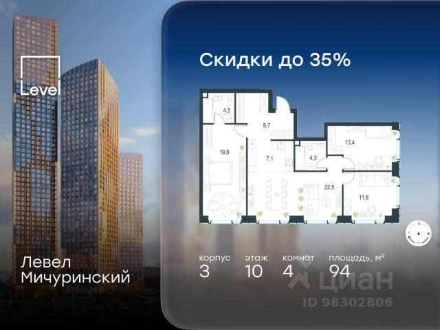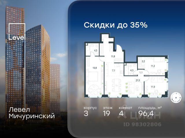 Цена указана с учётом скидки при 100%-й оплате, несубсидированной ипотеке, рассрочке (кроме программы "Рассрочка 0%"). В жилом квартале, расположенном на границе с природным заказником "Долина реки Очаковки", продаётся 2-комнатная квартира площадью 37.30 кв.м с отделкой white box. Квартира расположена на 25 этаже 30-этажного корпуса 3 в жилом комплексе бизнес-класса Левел Мичуринский (компания Level Group/Левел групп). Отличная транспортная доступность: - от 10 мин. пешком до станции метро "Мичуринский проспект" - 15 мин. пешком до станции метро "Аминьевская" - 7 мин. на авто до МКАД - 10 мин. на авто до ТТК - 15 мин. на авто до Москва-Сити Продуманный архитектурный проект: - Выразительная архитектура от известных бюро: корпуса 1-6 - СПИЧ, корпуса 7-13 - Borisov Architects; - Из окон открываются живописные виды на парки, Москва-Сити и МГУ; - Высокие потолки до 6,35 м; - Стильные лобби с окнами в пол и высокими потолками до 4,7 м; - С каждого этажа дома на лифте можно спуститься в подземный отапливаемый паркинг. Расположение: Жилой комплекс Левел Мичуринский строится в одном из самых зелёных районов Москвы - Очаково-Матвеевское. Этот уголок столицы идеален для поддержания здорового образа жизни. В шаговой доступности от проекта находятся заказник "Долина реки Очаковки" - 1 мин. пешком и Очаковский парк - 7 мин. пешком. На велосипеде можно добраться до таких парков, как "Событие", парк Олимпийской деревни, парк 50-летия Октября и парк Школьников. В 15 минутах езды на авто расположено более 30 детских садов (из них 14 в пешей доступности), 32 школы (из них 13 в пешей доступности) и 14 вузов. Также в ближайшем окружении - более 25 медицинских учреждений, 11 спортивных клубов и 22 продуктовых супермаркета. Внутренняя инфраструктура: На территории жилого комплекса строится три детских сада и школа. На первых этажах домов откроется супермаркет, фитнес-центр, ресторан, кафе и другие сервисы. Подземные этажи займут паркинги: трёхуровневые - в этапах 1 и 2, одноуровневый - в этапах 3 и 4. Преимущества проекта: - 4,5 га благоустроенной территории с видовым мостом, уличным кинотеатром, зонами для тихого отдыха, работы, воркаута, площадки для петанка, футбола, настольного тенниса и пляжного волейбола. - Дизайнерские лобби с панорамным видом на двор, мойками для лап животных и комфортными зонами ожидания. - Безопасность жителей: круглосуточное видеонаблюдение всех зон общего пользования (лобби, лифты, паркинги, детские площадки), система контроля доступа, управление видеодомофоном через мобильное приложение, единый ключ доступа на территорию жилого комплекса. - Технологии и комфорт: высокоскоростной Wi-Fi в лобби и на придомовой территории, автоматическая система контроля и учёта ресурсов, абонентская связь с консьержем, распознавание номеров автомобилей при въезде в паркинг и выезде из него.