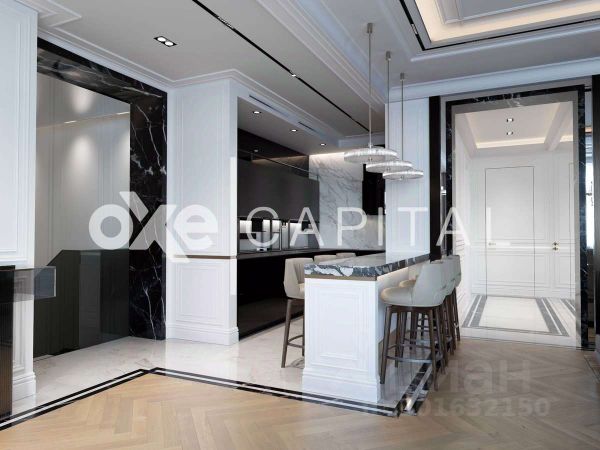 Квартира с тремя спальнями общей площадью 280 м² в клубном комплексе делюкс-класса "Парк Палас" на "Золотой Миле" в Хамовниках. Квартира с новой отделкой расположена на 3-м этаже. В оформлении использованы натуральные материалы — мрамор от компании "КАМ", колонна из кварцита от Aisberg, гранитные подоконники Magma, на полу тонированный дуб. Остальные материалы: алебастр, латунь, эксклюзивный шпон, натуральные камни, перламутр, хрусталь, авторское стекло, шелк, бархат.