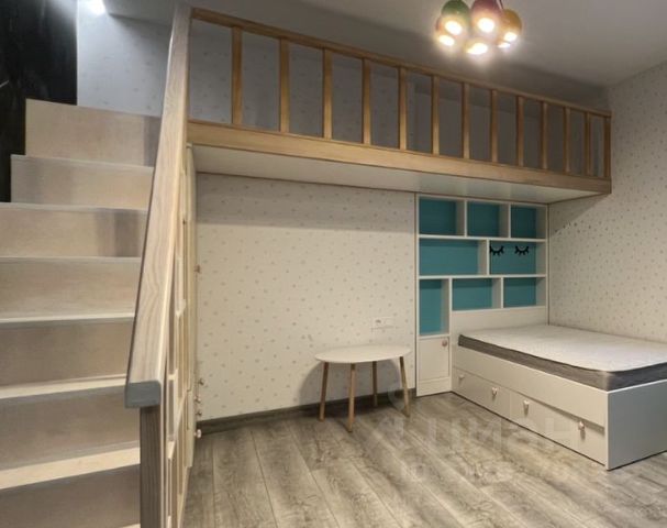 Спальня 16 м² оборудована рабочей зоной, современным проектором JVC, системой хранения. Вторая спальня (детская) с двухуровневой кроватью, рабочей зоной и вместительной системой хранения; предлагается фото с альтернативной меблировкой (диван).
