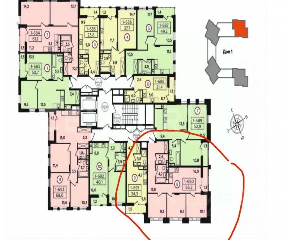 Общая: 25.2, из них-2.8 кв.м. балкон; жилая- 12 кв.м. ; кухня- 3 в.м.; душевая-3.1 квм; прихожая (холл)-4.4 кв.м.