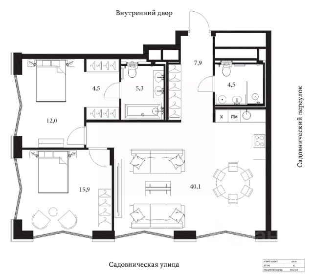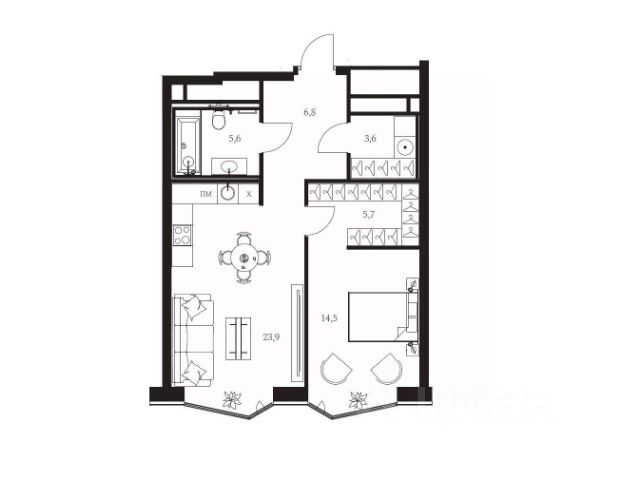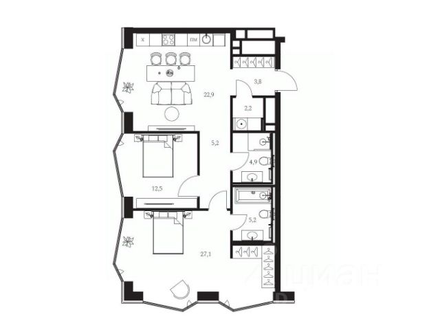 Планировкой можно предусмотреть большую (22,9 метра) кухню со столовой зоной или зоной гостиной, мастер-спальню (27,1 метра) с санузлом и гардеробной/кабинетом, вторую спальню/детскую/кабинет, совмещенный санузел, прихожую и зону постирочной.