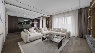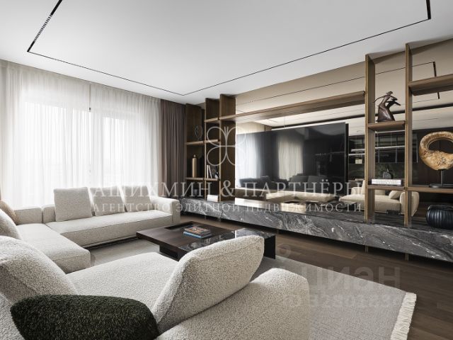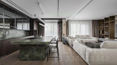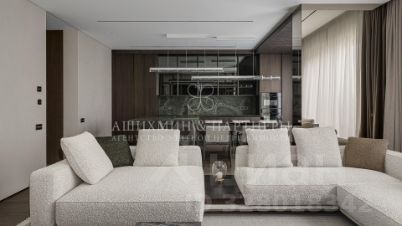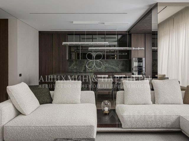 В квартире выполнена премиальная дизайнерская отделка с использованием высококачественных и натуральных материалов, таких как: натуральный мрамор, анодированная бронза, натуральный итальянский шпон, анодированная латунь.
