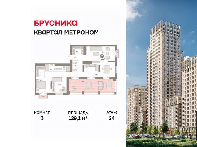 Квартира с кухней-гостиной и тремя спальнями в квартале "Метроном". Особенности планировки: второй санузел, предчистовая отделка, французский балкон. квартиры в нашей базе: КВМ-КВМ02-11-11.30.4.