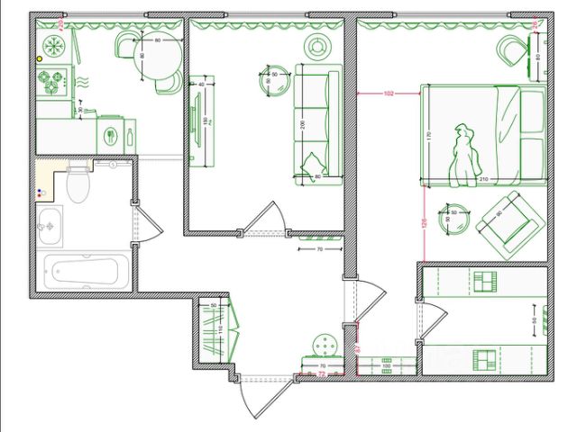 В квартире функциональная продуманная планировка, включающая в себя выделенную спальню с отдельной вместительной гардеробной, просторную светлую гостиную, полностью оборудованную качественной техникой кухню и дизайнерский санузел с полноценной ванной.