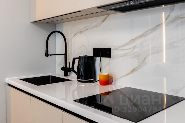 В кухне установлен кухонный гарнитур фирмы Kapittel, выполненный под заказ из Австрийских материалов, шелковистые суперпрочные фасады, покрытые 7-слойной эмалью, механизмы Blum, столешница кварцевая фирмы Ligron, вся встроенная техника фирмы Kuppersberg - встроенный холодильник, посудомоечная машина, духовой шкаф, варочная поверхность, вытяжка, винный шкаф. Диван, встроенный шкаф, стол, мягкие стулья, телевизор LG, подвесная ТВ полка.