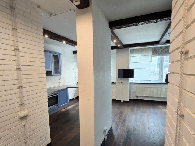 Все есть для жизни: кухонная мебель со встроенной техникой (вытяжка с отводом в вентиляцию), раскладывающийся диванчик на кухне, мощный кондиционер над входной дверью.