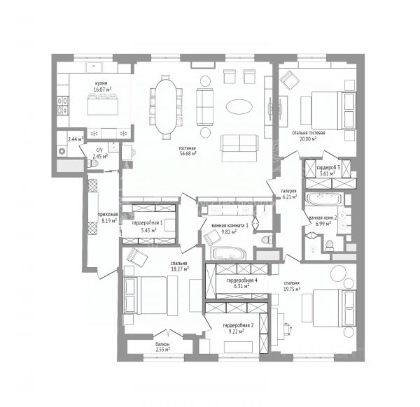 Планировочное решение (кухня гостиная, три спальни, три уборных, четыре гардеробных) дает возможность как проводить семейные ужины и вечеринки, так и уединиться.
