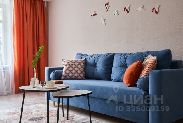* В гостиной: двухместный раскладной диван, тумба, рабочая зона, кресло и журнальные столики