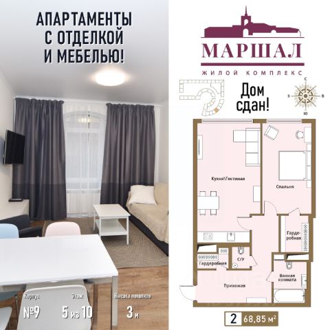 Продаются 2-комнатные апартаменты в сданном доме (Маршала Рыбалко, 2К9), срок сдачи: IV-кв. 2011, общей площадью 60.45 кв.м., на 8 этаже. С чистовой отделкой и мебелью. МФК "Маршал" - столичный комплекс бизнес-класса, построенный по индивидуальному архитектурному проекту от известного архитектора. В 2014 году МФК "Маршал" стал лауреатом премии TREFI, одержав победу в номинации "Лучший строительный проект бизнес-класса в Москве". Разный формат недвижимости в составе МФК "Маршал" и развитая инфраструктура воплощают концепцию Live & Work ("Живи и работай"). В комплекс, помимо жилых помещений, входит деловой центр "Маршал" класса В +, где можно купить или взять в аренду офисное помещение. Таким образом, купив апартаменты в МФК "Маршал", вам не придется уезжать далеко, чтобы поработать в офисе. Развитая собственная инфраструктура включает: 2-х уровневый подземный паркинг на 1200 м/мест, детский сад, фитнес-центр с бассейном, уютное кафе, итальянский ресторан, салон красоты и другие предприятия социально-бытовой сферы. Территория комплекса огромная - даже по московским меркам: участок в 6,3 га. Застройка занимает лишь треть этой территории, на остальном пространстве предусмотрена зеленая зона с деревьями, которые сохранили при строительстве комплекса, включая уникальный вековой пробковый дуб. Здесь разбит сквер с аккуратными аллеями для прогулок, цветниками, а в центре установлен фонтан. В комплексе проведено ландшафтное озеленение и обустроены детские площадки с качелями, горками, игровыми комплексами. Площадки покрыты специальным мягким покрытием, которое минимизирует риск травматизма при падении ребенка. Вся территория комплекса огорожена и охраняется собственной службой безопасности! Комплекс имеет уникальное расположение рядом с транспортно-пересадочным узлом новой станции "Панфиловская", в пяти минутах ходьбы от станции метро "Октябрьское поле". К тому же, близ комплекса проходит улица Народного Ополчения, входящая в состав Северо-Западной хорды.