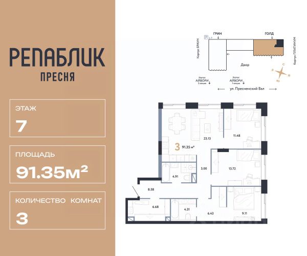 Рассрочка 0% с первым взносом от 20%, ипотека с субсидией или наличные. Подберём способ оплаты индивидуально. Продается 4комнатная квартира на 7 этаже от застройщика Страна Девелопмент. Площадь квартиры 91.35 кв. м. Дизайн-квартал "Republic" — новый проект премиум-класса в Москве от федерального застройщика "Страна Девелопмент". ЦАО, Пресня, 7 мин. от метро "Белорусская". 10 жилых башен и 4 восстановленных здания локомотивного депо образуют уникальное пространство. "Republic" — место, где вы ощутите гармонию истории и современности. За 12 мин. вы сможете дойти до Московского зоопарка, за 10 мин. на авто доехать до Патриарших прудов и Белого дома. Преимущества • Благоустройство. SPA-комплекс с бассейном и термами, гастрономический, учебный и шопинг-центры, приватный бульвар и яркие арт-пространства — для жителей предусмотрены все элементы премиального комфорта. • Панорама на центр. Наслаждайтесь видами ЦАО каждый день: панорама на историческую Пресню и башни Москва-Сити — из своей квартиры или с приватной террасы на крыше. • Концептуальное лобби в каждой башне. С общей террасой на кровле, с библиотекой, коворкингом и фитнес-рум. Стойка консьержа перетекающая в бар и др. • Современные форматы квартир. Свободные планировки, с террасой или балконом, с возможностью установки камина, от 1-комнатных до пентхаусов. Отделка Квартиры сдаются без отделки или в формате White box. При White box уже выполнены все шумные и грязные работы: произведена разводка электричества с подрозетниками, установлены откосы из гипсокартона, устроена стяжка пола с шумоизоляцией и др. Способы покупки Сотрудники "Страна Девелопмент" будут сопровождать вас на каждом этапе сделки, помогут получить одобрение по ипотеке или снизить ежемесячный платеж. - ипотека (стандартная/с субсидией/траншевая) - рассрочка (с ПВ от 20%) - с использованием материнского капитала - оплата наличными Купить квартиру на улице Пресненский Вал в Москве.