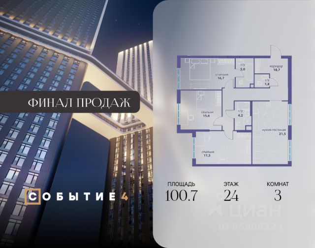 Продаётся 3-комнатная квартира от застройщика: общая площадь 100.70 м², жилая 49.80 м², кухня 21.50 м², 24-й этаж, жилой квартал "Событие-3", корпус 1 (секция 2) Срок сдачи: 1 квартал 2025 года. Позвоните сейчас и забронируйте квартиру! Продуманный до деталей. Созданный для жизни, полной счастливых событий. Парк-квартал СОБЫТИЕ - это жизнь класса премиум в престижном районе на Мосфильмовской улице. Архитектура мирового уровня. Выигрышное расположение на границе природного комплекса "Долина реки Раменки". Все для комфортной жизни и досуга: от детсадов и школ до ресторанов и медцентров. И новая точка притяжения - уже готовый парк "Событие" с пространствами активности для всех возрастов и интересов. Особенности квартала: • "Парящие" мосты и парк под облаками - уникальный дом с самыми завораживающими видами из окон "в пол" • Собственный парк - сразу за порогом! • Архитектурная концепция от известных международных бюро LDA Design и UHA London • Инфраструктура "тапочной доступности": в кафе, школу, магазин - за пару минут! • Внутренний двор - настоящее продолжение вашего дома: закрытая охраняемая территория без машин, развивающие детские площадки, воркауты-зоны для тех, кто хочет быть в форме, площади для праздников и посиделок с соседями.