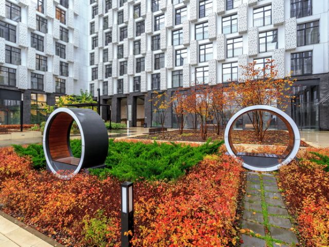 Двор обладает большим количеством мест общего пользования: беседки, качели, скамейки, сад с фруктовыми деревьями — всё это будет радовать вас и вашу семью.