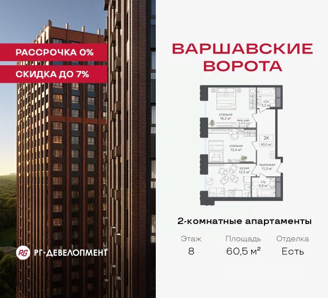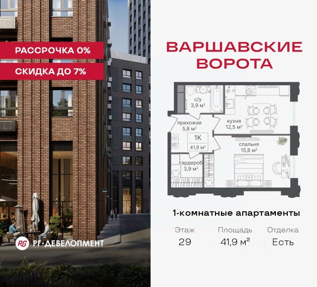 Рассрочка 0% + скидка 5%. Первый платёж 50% при ДДУ, второй 50% — через 12 мес. до ввода ЖК. Продаются 1-комнатные апартаменты 40,6 кв.м. в МФК "Варшавские ворота" на 25-м этаже 30 этажного дома. МФК "Варшавские ворота" — это проект, в котором учтен широкий спектр требований: от транспортной доступности и развитой инфраструктуры до архитектурной выразительности и экологического окружения. Апартаменты в МФК "Варшавские ворота" подойдут для тех, кто ищет продуманное жилье в Москве или готовый инвестиционный актив. Апартаменты здесь — это: - возможность жить комфортно в удобном городском формате — с природой, метро, сервисом и паркингом; - возможность купить лот с готовой отделкой, чтобы вложить минимальные инвестиции в ремонт и получить максимум возможностей от сдачи; - экономия на налоге на имущество, кадастровая стоимость апартаментов ниже ~ на 30% кадастровой стоимости квартиры; - высокая инвестиционная доходность объекта за счет более низкой цены покупки по сравнению с квартирой. Коротко о важном: - 1 минута пешком от м. Аннино; - Удобные выезды на Варшавское шоссе и МКАД; - Вид из окон на Битцевский лес и Аннинский лесопарк; - Высота потолков 2,7 - 3 м; - Закрытый двор-парк; - Школы и детские сады в 10-15 минутах пешком от дома; - Технические лоджии для размещения кондиционеров; - Подземный паркинг; - РГ-Девелопмент — ТОП-20 крупнейших застройщиков России. Проект сочетает в себе современную архитектуру и продуманное благоустройство с уникальным природным окружением. Всего в нескольких минутах от дома — девять парков, каскад прудов и крупнейшие лесопарковые зоны Москвы, создающие ощущение жизни в зеленом оазисе посреди мегаполиса. Архитектурная концепция - стиль Чикаго в Москве. Выполнена в минималистичной эстетике с использованием клинкера и декоративного кирпича. Фасады подчеркивают строгие линии и современный стиль, а входные группы разработаны московским бюро Syntaxis. Лобби оформлены с применением керамогранита, декоративной штукатурки и гипсовых панелей, детали из латуни добавляют изысканности. Пространство оживляют гербарии, композиции из сухоцветов и авторские панно. Проект находится в одной минуте пешком от метро "Аннино", в 12 минутах от станции "Улица Академика Янгеля" и рядом с МЦД-2 "Красный Строитель". Для автомобилистов предусмотрен прямой выезд на Варшавское шоссе и два съезда на МКАД, что позволяет быстро добираться в любую часть города. Среди планировочных решений представлены разнообразные форматы: от функциональных студий до просторных 4-комнатных квартир и апартаментов площадью от 22 до 105 м². Высокие потолки усиливают ощущение простора, а продуманные планировки включают мастер-спальни, гардеробные, угловые окна, объединённые кухни-гостиные и несколько санузлов. Центральное пространство комплекса — закрытый двор без машин. Он разделён на функциональные зоны: детские игровые комплексы, спортивные площадки, воркаут-зоны и уютные места для тихого отдыха. На первых этажах размес