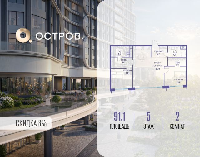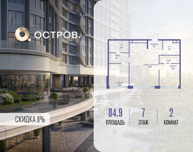 Скидка до 8% действует до 31.03.2026 г. при 100% оплате и не субсидированной ипотеке. Продаётся четырехкомнатная квартира от застройщика: общая площадь 124.90 м², жилая 53.90 м², кухня 35.00 м², 3, жилой квартал "Остров 7", корпус 7 (7 квартал) (секция 2). срок сдачи: 4-кв. 2025. , 3 санузла: 1 раздельный и 2 совмещенных. В жилой зоне 2 больших окна на одну сторону, хорошая инсоляция. Позвоните сейчас и забронируйте квартиру! Купите квартиру в доме у прибрежного парка, в квартале ОСТРОВ.7. Это семь корпусов премиум- и бизнес-класса в одном из лучших мест ОСТРОВА - между бульваром и парком, поблизости от реки. Стильные корпуса имеют узнаваемый вид благодаря бионической пластике фасадов, приподнятых над землей. Для жителей предусмотрены детский клуб, фитнес-рум, коворкинг, переговорные, лаунжи. На крышах устроены видовые общественные пространства с зонами для отдыха и спорта. Двор расположен на двух уровнях: нижний ландшафтный парк и верхняя городская терраса. ОСТРОВ.7 - часть жилого комплекса на западе Москвы, в 15 минутах езды от центра. Это настоящий заповедник посреди большого города, в окружении реки и 650 га заповедников. Здесь все необходимое находится по соседству: от детского сада до супермаркета, от фитнес-зала до серфинг-центра. На территории созданы все условия для отдыха и общения: клубная инфраструктура в домах и дворы-парки, набережные и променады, маршруты для спортсменов, детей и возрастных жителей. В нескольких минутах ходьбы расположена станция метро "Терехово" БКЛ. На автомобиле - 10 минут до Москва-Сити и 15 минут до Садового кольца.