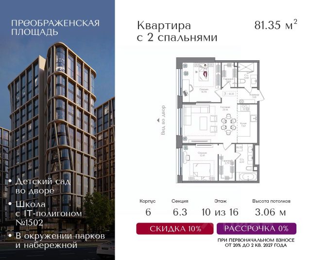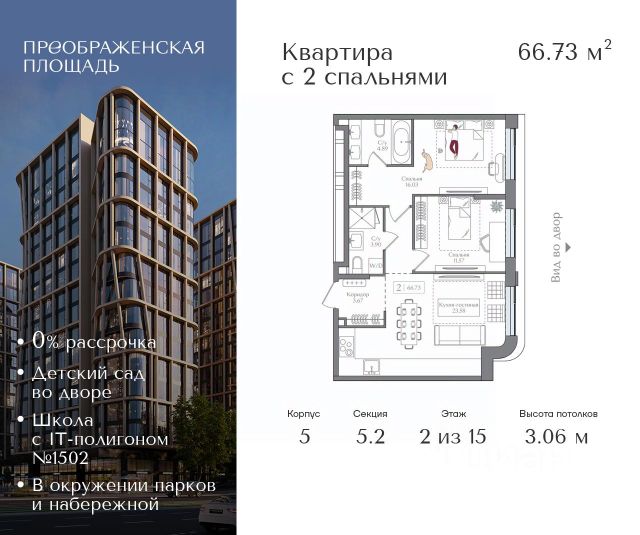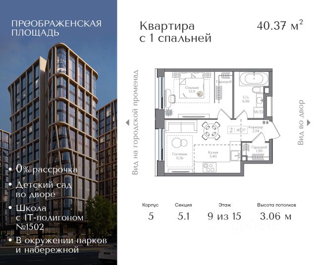 Рассрочка 0% от застройщика. Первоначальный взнос от 20%. Предложение действует до 31 декабря 2025 года Квартира на 4 этаже в жилом комплексе премиум-класса "Преображенская площадь". Общая площадь: 43.8 кв.м. Проект премиум-класса в историческом районе Москвы. До метро "Преображенская площадь" 3 минуты пешком. Квартиры сдаются без отделки и в свободной планировке, чтобы жители могли оформить пространство с учетом своей индивидуальности. Высота потолков от 3,15м, широкоформатное остекление, 3-5 квартир на этаже. Система Умный дом. Дизайнерские лобби. Внутренний двор 1,5 га функциональное и безопасное пространство для игр, работы и занятий спортом. Пешеходный променад для прогулок. Дома переменной этажности. Есть подземный паркинг. Жилой комлекс находится в окружении парков Сокольники, Черкизовский, Измайловский, заповедника Лосиный остров и ВДНХ, а также вблизи пешеходной набережной. Комфортная удаленность от центра: 7 минут на автомобиле до ТТК, 8 минут до Садового кольца, 25 минут до Кремля.