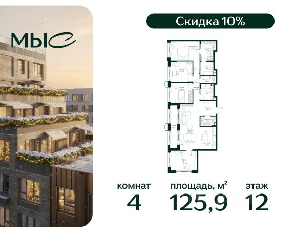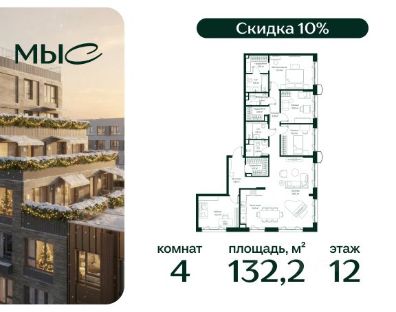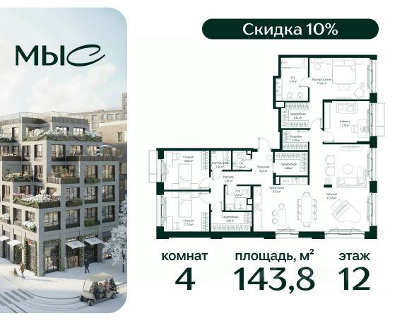 Прямая продажа от застройщика. Продаётся 4-комнатная квартира общей площадью 143.84 м² без отделки в премиальном жилом комплексе "МЫС" на 12-м этаже 12 этажного дома. Квартира расположена в корпусе "Сибирь". Проект МЫС — это, прежде всего, идеальное место для семей. В рамках проекта построят государственную школу, два детских сада и дворец спорта площадью 20 000 м2 с термальным комплексом, выплывным бассейном, фитнес-залом, теннисными, сквош и падел кортами и секциями для детей. На территории площадью, сравнимой с тремя парками Зарядье, появятся кафе и рестораны, пруд с набережной, спортивные и детские площадки, скейт-парк, лыжные и веломаршруты. Расположение: - 2 минуты до скоростной трассы М1 и Минского шоссе; - 10 минут до МКАД; - 15 минут до МЦД Лесной Городок - 20 минут до делового центра "Москва-Сити"; - 28 минут до аэропорта "Внуково". Благоустройство: - велосипедные и лыжные маршруты; - собственная набережная и парк; - лаунж-зоны в окружении природы; - беседки у очага; - дворец спорта площадью 20 000 м²; - термальный комплекс с тремя бассейнами; - 4 теннисных и падел-корта; - 6 сквош-кортов; - многофункциональный спортзал; - скейт-парк; - просторная площадь для прогулок с фонтаном; - детский клуб с творческими секциями; - гастро-доминанта; - кафе у пруда, рестораны, ритейл. Окружение - соседство с лесным фондом; - школа на 1250 мест и 2 детских сада на 350 и 255 мест; - Дубковский и Подушкинский леса, парк "Рассказовка", Мещерский парк. Действуют специальные условия при 100% оплате, подробности уточняйте у менеджера в офисе продаж.