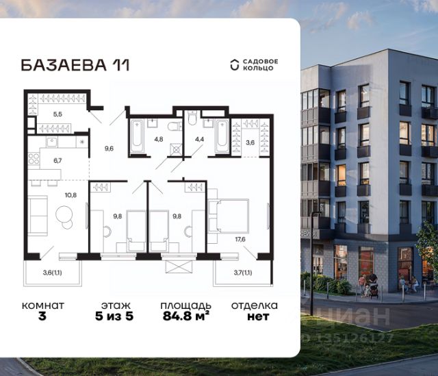 Продается квартира в ЖК "Базаева, 11" с 2 спальнями на 5 этаже 5 этажного дома. Общая площадь: 59 кв.м. Высота потолков 2.72 м. Срок сдачи 2 квартал 2027 г. Эскроу-счет. Застройщик ГК "Садовое кольцо". -Расположение Жилой комплекс в экологически чистом районе Московской области городском округе Шаховская. Камерное пятиэтажное здание находится в пешей доступности от всей необходимой инфраструктуры. Автостанция Шаховская расположена в 10 минутах от дома. Всего в 11 минутах ходьбы находится ж/д станция Шаховская, откуда удобно добраться электричкой до Рижского вокзала. Дорога до МКАД займет 1,5 часа на автомобиле. -Инфраструктура Проект расположен рядом с современным теннисным центром и Дворцом торжеств. В шаговой доступности — детская школа искусств, Шаховская гимназия, школа 1 и три детских сада. Всего за 3 минуты от дома можно дойти до Городского парка — здесь вас ждут аттракционы, верёвочный городок, тюбинговая горка и ресторан. Парк соседствует с живописным сквером у реки, украшенным подвесными мостами, ротондой и фонтанами. -Внутренний двор На территории проекта появится огороженная детская площадка, рассчитанная на детей всех возрастов, — с песочницей, канатным комплексом и зоной для игр. Для любителей активного образа жизни будет обустроена спортивная площадка с теннисным столом, турниками, тренажёрами и гимнастическими брусьями. Для автовладельцев на территории проекта предусмотрена удобная плоскостная парковка на 81 машино-место. -Архитектура Монохромное здание оформлено декоративным кирпичом и штукатуркой в тёплых светло-серых и насыщенных серых тонах. Эстетику фасада подчёркивают террасные ограждения и корзины для кондиционеров, выдержанные в единой цветовой гамме. -Входная группа Входные группы спроектированы на уровне земли — без ступеней и перепадов. Такой подход обеспечивает комфортный доступ в подъезд с коляской, чемоданом или велосипедом и подчеркивает продуманную архитектуру дома.