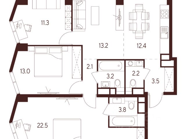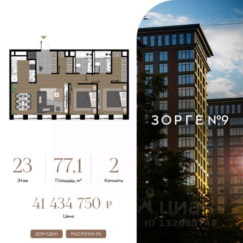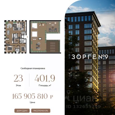 Функциональная планировка: гостиная 44 м² со столовой зоной, кухня 20 м² с островом, мастер-спальня 20 м² с гардеробной 4 м², санузел 18 м² с сауной и джакузи, детская спальня 20 м², гостевая спальня 17 м², просторный холл 28 м², гостевой санузел. Все спальни выходят на застекленную лоджию площадью 12 м². Выполнен дизайнерский ремонт с использованием премиальных материалов: дубовый паркет, столешница из мрамора, плитка Emperador, тиковое дерево, ванна в мраморных слэбах с отделкой деревянными панелями и плинтусами, душевая кабина из мрамора. Установлена сплит-система кондиционирования, на кухне встроенная техника Miele, в холле — встроенные шкафы, библиотека. Из окон открываются виды на две стороны света: на парк Ходынское поле с прудами и панорамный вид в сторону Сити и парка Березовая роща. Есть возможность арендовать парковочное место в подземном, охраняемом паркинге.