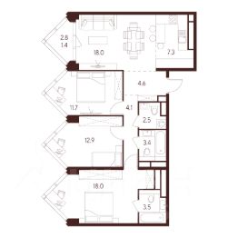 Видовая квартира с тремя спальнями общей площадью 187 м² в комплексе бизнес-класса "Гранд-парк" на 18-м этаже.