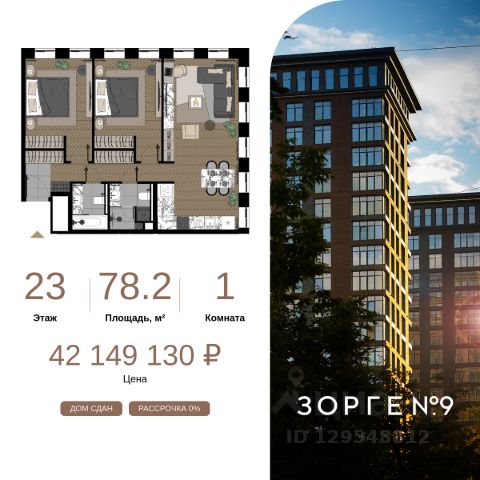 "Зорге 9" — готовые апартаменты бизнес-класса на Ходынке. 10 минут до Москва-Сити. Архитектура: 3 современных корпуса с фасадами в стиле архитектуры Нью-Йорка и с сервисами премиальных отелей, высотой до 23 этажа. Строгие линии, панорамные окна создают ощущение неподдельной роскоши и комфортной жизни в сердце мегаполиса. Проект награжден авторитетной премией European Property Awards. Резиденции: Свободная планировка, небольшая глубина этажа, огромные панорамные окна в пол до 3,6 м и высота потолков до от 3,3 до 4,3 м позволяют реализовать самые смелые концептуальные идеи и создать идеальный интерьер с учетом всех пожеланий. Вдохновляющие виды на город украсят ваш апартамент лучше любой картины. Есть возможность приобретения дизайн-проекта и полной меблировки апартаментов от партнеров девелопера. Расположение: 3 мин. пешком до парка Березовая роща 10 мин. пешком до Ходынского поля 10 мин. до ТЦ Авиапарк 30 минут до Шереметьево 10 мин до Москва-Сити или 1 станция до Москва-Сити 5 минут до ТТК 4 станции метро в шаговой доступности: 6 мин м. Полежаевская (фиолетовая ветка) 7 мин МЦК Зорге (МЦК) 7 мин м. Хорошевская (голубая ветка) 10 мин МЦК Хорошёво (МЦК) Благоустройство: Собственный парк 2 га с амфитеатром и поющими фонтанами. В парке высажено 136 деревьев и более 11 000 кустов и мелких растений из немецких питомников. Площадка для йоги и воркаут-зона со спортивными площадками. Теннисные столы и детский плейхаб Две башни Авторское гранд-лобби В лобби предусмотрена лаундж-зона, чайная с камином, комната для хранения велосипедов и колясок. Доступ по системе FACE ID. В отделке лобби и лифтовых холлов использован декоративный камень итальянского бренда Atlas Concorde Пентхаусы На верхнем уровне комплекса расположены роскошные просторные пентхаусы с высотой потолка до 4,2 метра и панорамными окнами до 3,6 метров, открывающими великолепные виды на столицу. Пентхаусы с выходами на собственные приватные террасы на кровле, площадью от 150 кв. м являются жильем high-уровня, демонстрирующим высокий статус владельца.