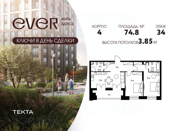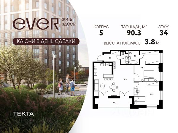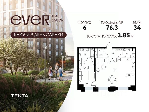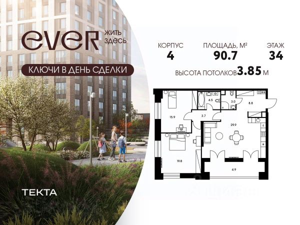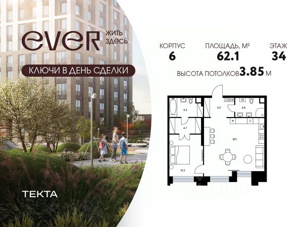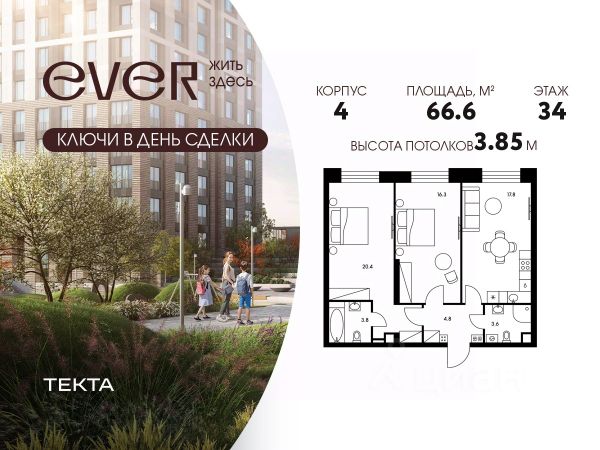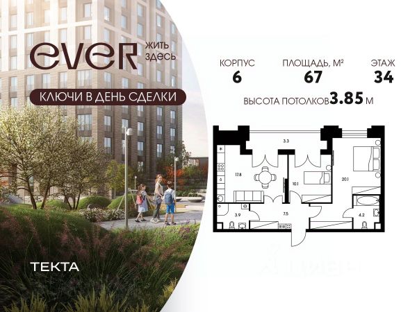 Рассрочка 0% с платежом от 120 000 ₽ в месяц. 3-комн. квартира в ЖК "Ever" на 34 этаже в 34 этажном здании Корпус 4. Общая площадь: 66.6 кв.м., жилая: 48.1 кв.м. Высота потолков 3.85 м. Top Floor — это пространство, которое сочетает в себе уникальный комфорт и элегантность. Увеличенная высота потолков создает ощущение простора и свободы, позволяя свету беспрепятственно заполнять каждый уголок. Здесь вы можете наслаждаться завораживающими панорамными видами на Сити, здание МГУ и Воронцовский парк, которые открываются из больших окон. Каждое утро вы встречаете, глядя на величественные силуэты, которые становятся частью вашего повседневного вдохновения. Город оживает перед вами, и каждый момент наполняется новыми впечатлениями. Утренние лучи солнца отражаются на стеклах, а вечерние огни создают атмосферу магии и уюта. Top Floor — это не просто место для жизни, это возможность наслаждаться атмосферой мегаполиса, оставаясь в уединении. Широкие пространства позволяют вам организовать интерьер по своему вкусу, а высокие потолки придают помещению особую элегантность. Вы можете создавать здесь уютную атмосферу для встреч с друзьями или просто наслаждаться уединением, наблюдая за жизнью города. Это место, где каждый день наполняется новыми красками и возможностями. Top Floor — ваш личный уголок, где царит гармония и комфорт, а виды на Москву становятся фоном для вашей жизни. Жилой комплекс EVER — это гармоничное сочетание динамики мегаполиса и умиротворенности природы. Всего семь минут неспешной прогулки отделяют вас от станции метро ""Калужская"", обеспечивая быстрый доступ ко всем преимуществам жизни в Москве. Вернувшись домой, вы попадаете в атмосферу спокойствия и комфорта. Продуманная инфраструктура комплекса включает в себя не только уютные квартиры, но и удобный подземный паркинг, избавляющий вас от хлопот с поиском места для парковки, а также индивидуальные кладовые помещения, где можно хранить все необходимое. В EVER вы найдете идеальное сочетание комфорта и удобства, позволяющее наслаждаться всеми преимуществами жизни в столице, не забывая о важности спокойствия и близости к природе.