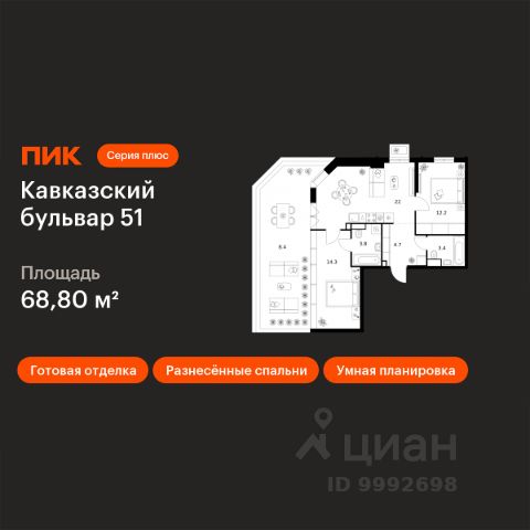 Продаётся 3-комн. квартира площадью 56,2 кв.м на 23 этаже 23 этажного дома (Корпус 3.3, Секция 3) проекта ПИК Кавказский бульвар 51. Светлый просторный подъезд на уровне земли, функциональная планировка, большие окна, c отделкой. "Кавказский бульвар 51" — современный жилой квартал в районе Царицыно. Проект частично реализован и находится в районе Царицыно, недалеко от одноимённого музея-заповедника. До метро "Кантемировская" — 17 минут пешком. За 20 можно дойти до станции "Чертаново". В 10 минутах на машине — МКАД, в 11 минутах — Варшавское шоссе, а в 16 минутах — ТТК. В проекте жилые дома высотой от 5 до 33 этажей, детский сад и школа. На первых этажах доступны магазины, кафе, салоны красоты и другие сервисы — чтобы купить кофе и свежий хлеб к завтраку, можно просто спуститься на лифте. В уютных дворах-парках есть места для отдыха и детские площадки. Для прогулок на свежем воздухе мы построим для жителей широкий пешеходный бульвар. В районе вокруг "Кавказского бульвара 51" есть всё для комфортной жизни: детские сады, школы, поликлиники, магазины и торговые центры. Девять минут на машине — и вы у музея-заповедника "Царицыно", где можно гулять среди исторических построек, лежать на траве под тенью деревьев или заниматься спортом на специальных площадках. Есть парки и поближе: до Аршиновского можно дойти за 8 минут, а до парка "Сосенки" — за 13 минут. Артикул 1009907 (Застройщик АО "СПЕЦИАЛИЗИРОВАННЫЙ ЗАСТРОЙЩИК "ТОРГОВЫЙ ДОМ СПУТНИК")