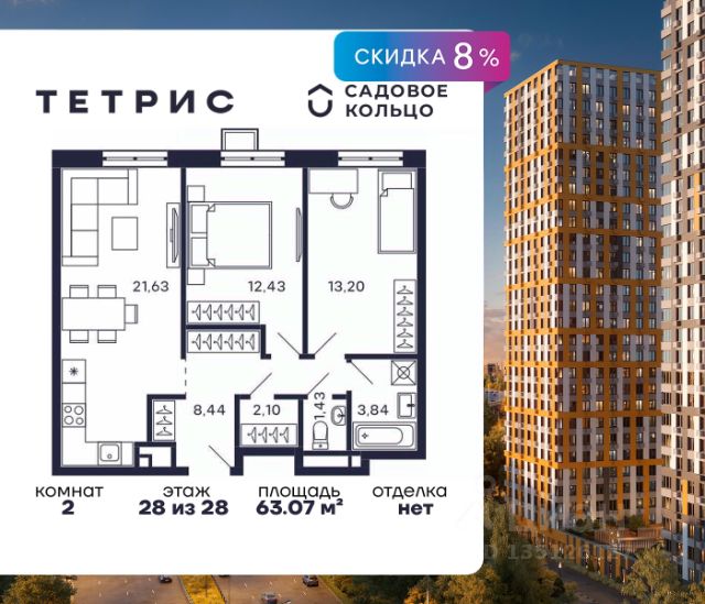 Успейте забронировать по акционной цене! Стоимость квартиры указана со скидкой, ваша выгода составит 1500561 рублей. Предложение ограничено. Звоните, чтобы узнать подробнее! Продается квартира в ЖК Тетрис с 2 спальнями на 28 этаже 28 этажного дома. Общая площадь: 63.07 кв.м. Высота потолков 2.95 м. Срок сдачи 2 квартал 2026 г. Эскроу-счет. Застройщик ГК "Садовое кольцо". Семейный жилой комплекс "Тетрис" с собственной развитой инфраструктурой, благоустроенным двором и функциональными планировочными решениями. Собственный двор-парк, детские и спортивные площадки. Продуманные зоны отдыха с ландшафтным дизайном. Охраняемая дворовая территория и круглосуточное видеонаблюдение. Рядом удобная транспортная развязка и станция МЦД Павшино. ЖК "Тетрис" объединяет все важнейшие факторы, формирующие комфорт: Просторный обустроенный двор — место, где весело проводить время с друзьями и семьей. Свой торговый центр, чтобы любая мелочь была под рукой. Удобная локация и транспортная доступность. Свои медицинский центр и школа с блоком начальных классов. Жилой комплекс "Тетрис" обеспечит вам идеальное пространство для жизни, где все необходимое под рукой. Благодаря этому вы получаете самый драгоценный ресурс - время на общение с друзьями и семьей, заботу о себе и личное развитие.