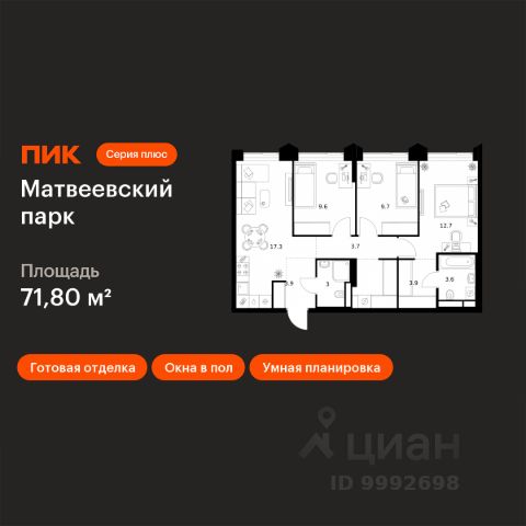 Цена указана с учётом скидки при 100%-й оплате, несубсидированной ипотеке, рассрочке (кроме программы "Рассрочка 0%"). В жилом квартале, расположенном на границе с природным заказником "Долина реки Очаковки", продаётся 3-комнатная квартира площадью 69.60 кв.м без отделки. Квартира расположена на 24 этаже 24-этажного корпуса 7 в жилом комплексе бизнес-класса Level Мичуринский (компания Level Group/Левел групп). Отличная транспортная доступность: - от 10 мин. пешком до станции метро "Мичуринский проспект" - 15 мин. пешком до станции метро "Аминьевская" - 7 мин. на авто до МКАД - 10 мин. на авто до ТТК - 15 мин. на авто до Москва-Сити Продуманный архитектурный проект: - Выразительная архитектура от известных бюро: корпуса 1-6 - СПИЧ, корпуса 7-13 - Borisov Architects; - Из окон открываются живописные виды на парки, Москва-Сити и МГУ; - Высокие потолки до 6,35 м; - Стильные лобби с окнами в пол и высокими потолками до 4,7 м; - С каждого этажа дома на лифте можно спуститься в подземный отапливаемый паркинг. Расположение: Level Мичуринский строится в одном из самых зелёных районов Москвы - Очаково-Матвеевское. Этот уголок столицы идеален для поддержания здорового образа жизни. В шаговой доступности от проекта находятся заказник "Долина реки Очаковки" - 1 мин. пешком и Очаковский парк - 7 мин. пешком. На велосипеде можно добраться до таких парков, как "Событие", парк Олимпийской деревни, парк 50-летия Октября и парк Школьников. В 15 минутах езды на авто расположено более 30 детских садов (из них 14 в пешей доступности), 32 школы (из них 13 в пешей доступности) и 14 вузов. Также в ближайшем окружении - более 25 медицинских учреждений, 11 спортивных клубов и 22 продуктовых супермаркета. Внутренняя инфраструктура: На территории жилого комплекса строится три детских сада и школа. На первых этажах домов откроется супермаркет, фитнес-центр, ресторан, кафе и другие сервисы. Подземные этажи займут паркинги: трёхуровневые - в этапах 1 и 2, одноуровневый - в этапах 3 и 4. Преимущества проекта: - 4,5 га благоустроенной территории с видовым мостом, уличным кинотеатром, зонами для тихого отдыха, работы, воркаута, площадки для петанка, футбола, настольного тенниса и пляжного волейбола. - Дизайнерские лобби с панорамным видом на двор, мойками для лап животных и комфортными зонами ожидания. - Безопасность жителей: круглосуточное видеонаблюдение всех зон общего пользования (лобби, лифты, паркинги, детские площадки), система контроля доступа, управление видеодомофоном через мобильное приложение, единый ключ доступа на территорию жилого комплекса. - Технологии и комфорт: высокоскоростной Wi-Fi в лобби и на придомовой территории, автоматическая система контроля и учёта ресурсов, абонентская связь с консьержем, распознавание номеров автомобилей при въезде в паркинг и выезде из него.