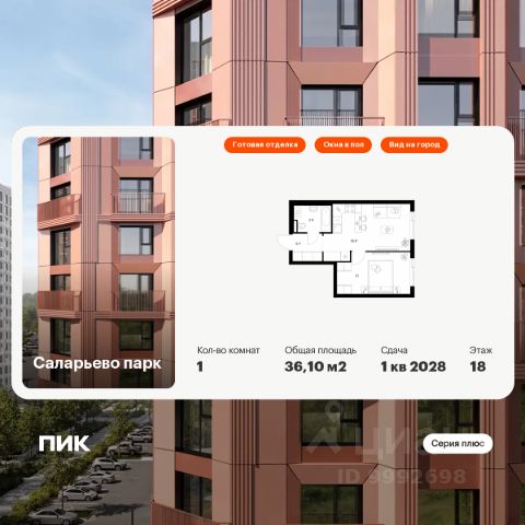 Продаётся 1-комн. квартира площадью 31,9 кв.м на 18 этаже 18 этажного дома (Корпус 74.4, Секция 4) проекта ПИК Саларьево парк. Светлый просторный подъезд на уровне земли, функциональная планировка, большие окна, предчистовая отделка. Жилой район "Саларьево парк" расположен в Новой Москве, в четырёх километрах от МКАД по Киевскому шоссе. Две станции метро: "Саларьево" и "Филатов луг", — находятся в пешей доступности от проекта. Дойти до них можно за 510 минут. В квартале уже создана качественная среда, где есть абсолютно всё для полноценной жизни, работы и отдыха. Благодаря удобному расположению проекта всё важное будет рядом: детские сады, школы, кафе и рестораны, шопинг в торговых центрах, фитнес и даже аэропорт. Все корпуса в квартале гармонично сочетаются, образуя единую городскую среду. Между собой их объединяет невысокая этажность и натуральная цветовая гамма. Здесь приятно гулять и проводить время на улице всей семьёй. В "Саларьево парке" создана уникальная образовательная среда, включающая в себя шесть школ, рассчитанных на 6 250 учеников. Две из них уже открыты, их посещает 2 300 детей. Также на территории "Саларьево парка" находится 12 детских садов, один из которых с бассейном. Сейчас уже открыты 7 садов. В "Саларьево парке" открыта уникальная игровая площадка — PlayHub "Оригами". Здесь есть ручей, горка-труба и рельефные холмы. Взрослые смогут отдохнуть в уютном кафе, пока дети играют. Также на территории проекта есть SportHub — большая спортивная зона, разделённая по интересам и возрастам. Здесь можно заниматься разными видами спорта: футболом, баскетболом, волейболом и стритболом. Зимой центральную часть площадки превращают в каток. Во дворах-парках жилого квартала есть места для отдыха, детские и спортивные площадки. На первых этажах домов расположены магазины, кафе и полезные сервисы. Также вблизи проекта есть несколько масштабных торговых центров. До ТЦ "Саларис" пять минут пешком, до "Рио", Metro Cash & Carry и "Леруа Мерлен" — пять минут на автомобиле. Артикул 1006618 (Застройщик ООО "Специализированный Застройщик "Тирон")