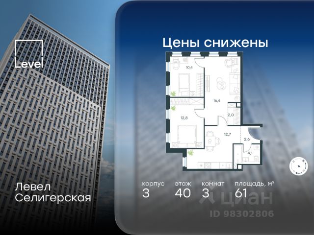 Прямая продажа от застройщика. Продаётся 3-комнатная квартира общей площадью 109.90 м² с предчистовой отделкой в ЖК "Селигер Сити" на 39-м этаже башни Лисицкого. Корпуса четвертой очереди ЖК "Селигер сити" названы в честь трех великих представителей науки и архитектуры, новаторское видение которых — слишком смелое для своего времени — нашло воплощение в уникальных домах жилого комплекса. Вдохновленные авангардными идеями знаменитого советского архитектора Эля Лисицкого, архитекторы создали яркий центр притяжения всего района, задающий новый стандарт жизни в современном мегаполисе — две высокие "Башни Лисицкого" с современной интерпретацией горизонтального небоскреба. Преимущества проекта: - 2 минуты пешком от метро "Селигерская" - Архитектурное решение от голландского бюро MLA + - Одна из самых больших придомовых территорий в Москве - Огороженная охраняемая территория, круглосуточное видеонаблюдение - Европейский подход к благоустройству от бюро Wowhaus: появится парадный бульвар, аллея с фонтаном и арт-объектом, что дополнит уже сформированное благоустройство: детские площадки для разных возрастов, площадки для воркаута, дорожки для бега и пеших прогулок, места для отдыха - Два детских сада, школа начальных классов и центр доп.образования - Искусственный пруд на территории комплекса с благоустроенной набережной и мостом - Продуманная концепция инфраструктуры: уютные кафе и рестораны, супермаркет, магазин фермерских продуктов, бытовые службы, салон красоты, детские сады - Ультрасовременные инженерные решения - Подземный паркинг с зарядными станциями для электромобилей, постами подкачки шин и келлерами - Лобби по индивидуальному дизайн проекту от европейского бюро Вlank Architects: лаунж-зоны, ресепшен, колясочная, помещение для мытья лап животным после прогулки - Надежный девелопер с опытом премиальных проектов MR Расположение комплекса: - 2 минуты от станции метро "Селигерская" - 7 минут на машине до станции метро "Окружная" - Предусмотрен удобный выезд в сторону ТТК (всего 9 км или 15 минут без пробок) - МКАД в 10 минутах на машине Компания MR предлагает своим клиентам специальные условия приобретения квартир в рамках программ ипотечного кредитования от банков-партнеров.