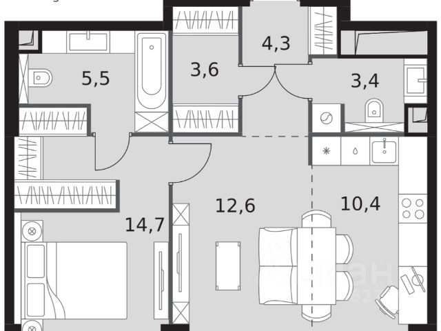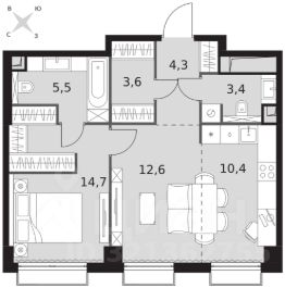 Функциональная планировка квартиры, разработанная по индивидуальному дизайн-проекту: просторная кухня-гостиная с панорамным остеклением , изолированная спальня с гардеробной зоной, совмещенный санузел, много мест хранения.