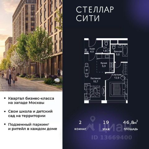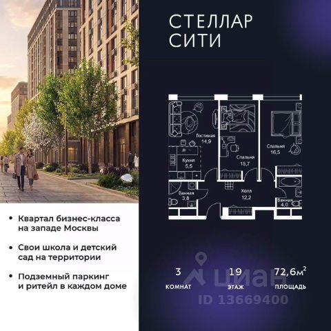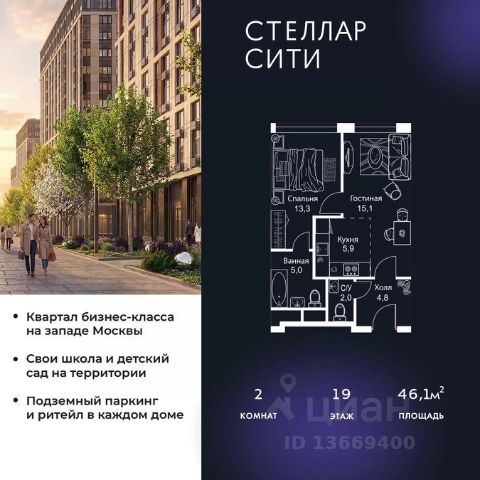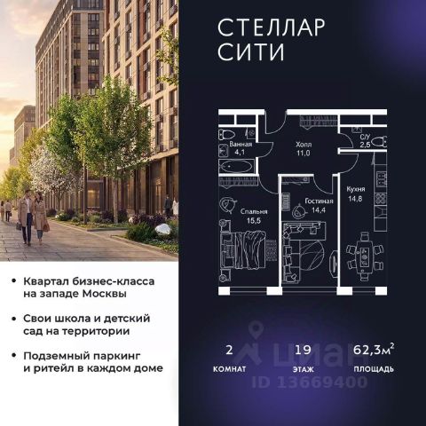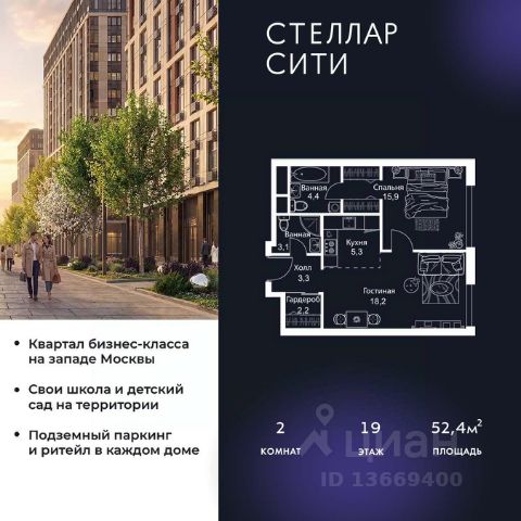 Продается квартира от надежного застройщика Tashir Estate в квартале бизнес-класса Stellar City в ЗАО Москвы. Площадь квартиры составляет: 52.4 кв. м, потолки: 3.1 м Квартира находится на 19 этаже, 4 корпуса жилого квартала Stellar City — микрогорода будущего на орбите Москвы. Stellar City — квартал в ЗАО Москвы вблизи инновационного центра Сколково. В окружении — 11 парков и природных зон, в том числе Долина реки Сетунь, Мещерский лес и парк развлечений The Rink. Город в городе Чтобы дом и инфраструктура вокруг отвечала динамичному лайфстайлу жителя мегаполиса, в основу проекта легла концепция город в городе, которая позволяет решать все бытовые вопросы in-home. В квартале будут возведены школа и детский сад, воркаут-зоны, променад, вело и беговые дорожки, детские площадки для каждого корпуса, а также коммерция на первых этажах для ежедневных покупок. Все необходимое — на расстоянии нескольких шагов. Изящные и лаконичные лобби Авторский дизайн, натуральные материалы в отделке и безупречный интерьер вне времени. Лобби и холлы в проекте бизнес-класса Stellar City ничем не отличаются от входных групп в премиум-сегменте благодаря качественным европейским материалам в отделке, стильному дизайну, консьерж-сервису и уютной зоне ожидания с журнальными столиками и мягкой мебелью. Комфорт и безопасность Закрытая территория, охрана, система СКУД, специально разработанное мобильное приложение дома для резидентов и подземный паркинг с круглосуточным наблюдением и доступом с помощью автоматического считывания номера авто.