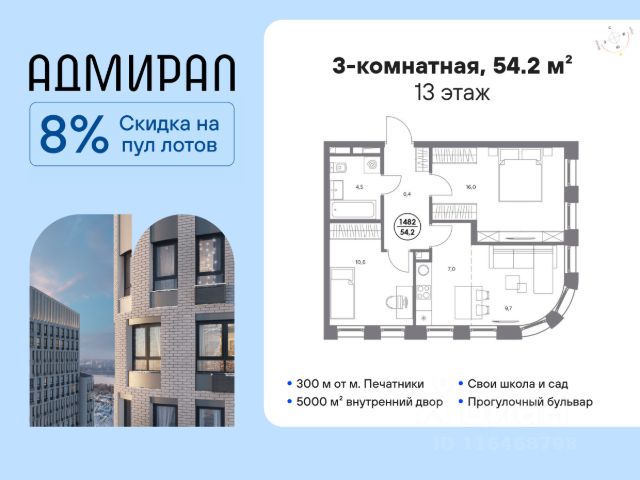 В динамично развивающемся районе Москвы, всего в 300 метрах от метро и в пешей близости от нового городского порта с протяженной набережной 13 км, свободной от автомобилей, продается 3-комнатная квартира площадью 60.00 м². без отделки. Квартира находится в корпусе жилого комплекса бизнес-класса "Адмирал", расположенного по адресу г. Москва, ул. Шоссейная, 4Д. (Застройщик - "Галс Девелопмент"). Новый амбициозный проект "Адмирал" станет частью одного из самых перспективных районов будущего - "Сити-2". В пешей доступности от современных башен Вас ждут живописные Люблинские пруды, 2 усадьбы с уникальной историей и уютный парк "Печатники" у Перервинского плёса. Район имеет отличную транспортную доступность: • 300 метров до станции метро "Печатники"; • Удобная пересадка на БКЛ и станцию МЦД-2; • 10 минут на машине до ТТК; • 15 минут до Садового кольца. Архитектура корпусов отличается динамичностью облика благодаря переменной этажности: высокие башни сочетаются с домами средней этажности. Изящным украшением становятся арочные витражи. Интеллигентный и современный стиль "Адмирала" продолжается в гранд-лобби: пастельные оттенки интерьера и фактурные элементы декора создают атмосферу безмятежного отдыха, особое ощущение простора дарят высокие потолки до 4 м и витражные окна. В домах предусмотрено от трех до шести скоростных лифтов, каждый из них спускается на любой этаж подземного паркинга и обладает удобными сенсорными панелями управления и низким уровнем шума. Благоустроенный двор площадью 5000 кв.м. украсят десятки видов гипоаллергенных растений. Здесь можно совершить приятный променад, по пути заглядывая за свежезаваренным кофе, уединиться за ноутбуком в комфортном коворкинге, занять ребенка играми в двухъярусном плейхабе или помедитировать на специальной площадке для йоги. Мягкий свет декоративных фонарей подчеркнет живописность местности, а чувство безопасности гарантируют круглосуточные системы видеонаблюдения. Дополнительные преимущества: • Высокие потолки от 2,9 до 3,25 м; • Бизнес-центр, школа и детский сад прямо на территории дома; • Подземный двухуровневый паркинг на 1955 машино-мест; • Кладовые помещения в тёплом контуре на 2м этаже; • Стрит-ритейл на первых этажах.