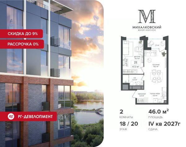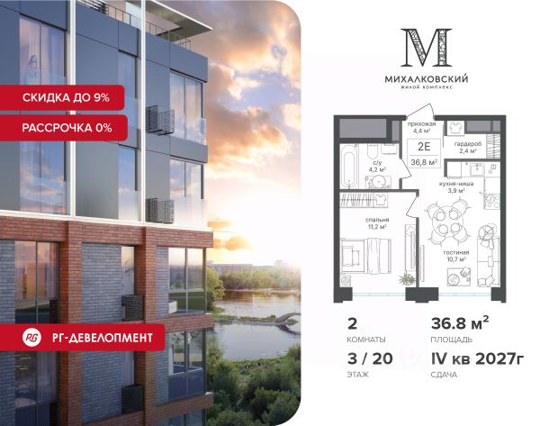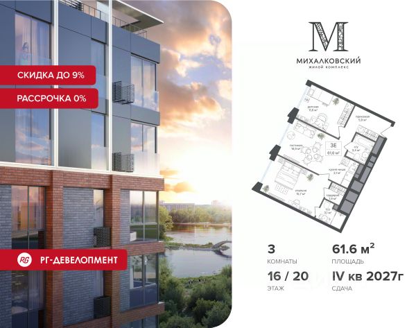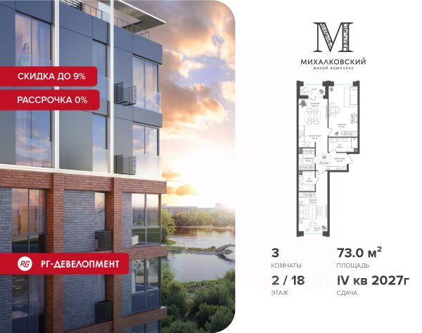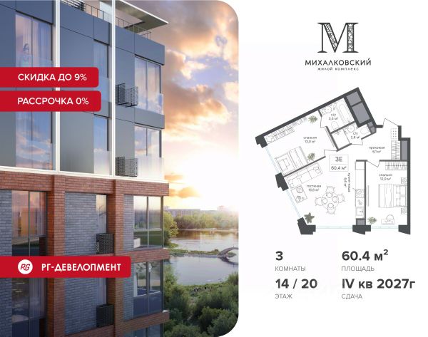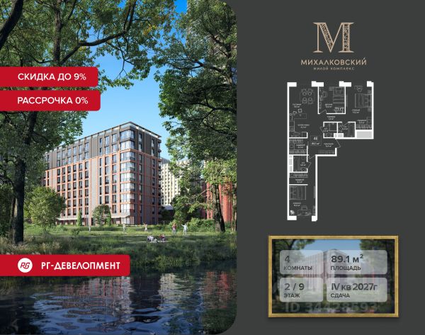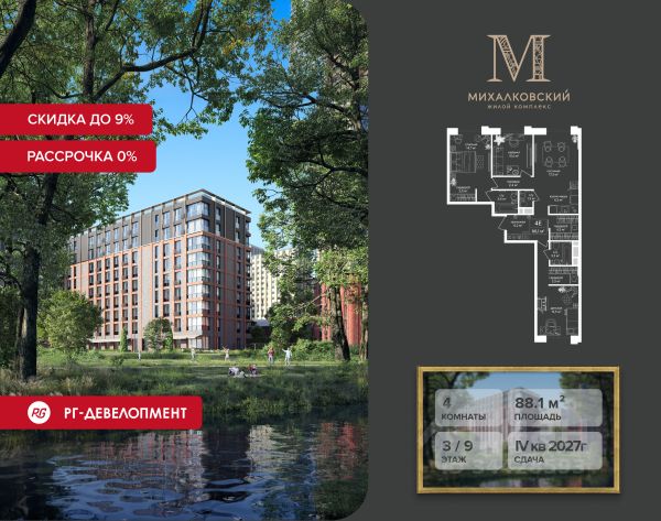 При приобретении квартиры доступна беспроцентная рассрочка с первым платежом от 30%. У покупателя также есть право воспользоваться скидкой в размере 5% от полной стоимости квартиры. - Первый платеж составляет 30% от стоимости объекта и вносится при заключении ДДУ - Второй платеж в размере 30% от стоимости объекта вносится через 6 месяцев с даты заключения ДДУ - Остаток 20% через 12 месяцев с даты заключения ДДУ, но не позднее 30.06.2027 - Остаток 20% не позднее 30.06.2027 - Действует на приобретение квартир в корп. 2, 7 Продаётся 3-к квартира 63,8 кв.м. в ЖК "Михалковский" на 4-м этаже 18 этажного дома. Скидка 9% при покупке квартиры! Ипотека для каждого! Полная стоимость кредита от 12,380% до 18,537%. Ставка от 0,11% в АО "Альфа-Банк", ген. лицензия ЦБ РФ 1326 от 16.01.2015. Ставка фиксируется на первые 12 месяцев, далее полная стоимость кредита от 22,022% до 24,599% ставка 21,59%. Первоначальный взнос — от 20,1% от стоимости квартиры. Срок кредитования — от 4 до 30 лет. Компания "РГ-Девелопмент" предоставляет скидку на квартиры в жилом комплексе. Акция действительна до 31.03.2026 включительно. Для того чтобы воспользоваться предложением, необходимо подписать договор на приобретение недвижимости до 31.03.2026 включительно. Действует программа "Растет семья - растет и квартира". Компания "РГ-Девелопмент" вошла в ТОП-10 девелоперов по объёму введённого жилья в "Старой Москве" по итогам 2025 года. Прямая продажа от застройщика! Квартиры без отделки. Срок сдачи IV кв. 2027г. Особенности проекта: Завораживающие виды Красивое благоустройство Уникальная локация для Москвы (рядом Головинский парк, пруды, усадьба Михалково) Рядом с центром В проекте присутствует: архитектура голландского бюро MLA+, зеленые зоны, транспортная доступность, благоустроенная территория, подземный паркинг, детский сад и выход на Головинский парк с пятью прудами. Название комплекса указывает на одну из его черт - соседство с имением Михалково. Позвольте себе жить в месте, где проводили свой досуг династии Дашковых и Паниных.
