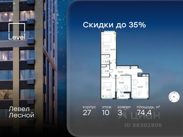 В районе, утопающем в густой зелени лесов, многочисленных парков и скверов, продаётся 4-комнатная квартира площадью 97.80 кв.м с отделкой white box. Квартира расположена на 6 этаже в жилом комплексе комфорт-класса Левел Лесной (компания Level Group/Левел групп).