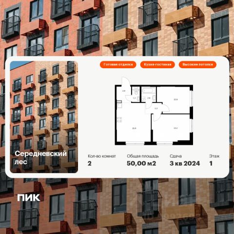 Продаётся 2-комн. квартира площадью 50 кв.м на 1 этаже 14 этажного дома (Корпус 3.2, Секция 2) проекта ПИК Середневский лес. Светлый просторный подъезд на уровне земли, функциональная планировка, большие окна, c отделкой. В 10 минутах на автомобиле находится станция метро "Внуково", а в 15 минутах — станции "Филатов Луг" и "Саларьево". От них до центра Москвы всего 3540 минут. На рейсовом автобусе от жилого квартала до метро "Филатов Луг" — 20 минут. На территории "Середневского леса" появилось общественное пространство с игровыми площадками, местами для отдыха, пешеходными маршрутами и велопарковкой — для прогулок, отдыха и встреч жителей квартала. Также внутри жилого квартала уже открыта школа на 1100 мест и детский сад для 325 малышей. В дальнейшем откроется ещё один сад для 340 детей. Артикул 865880 (Застройщик ООО "Специализированный застройщик Середнево")