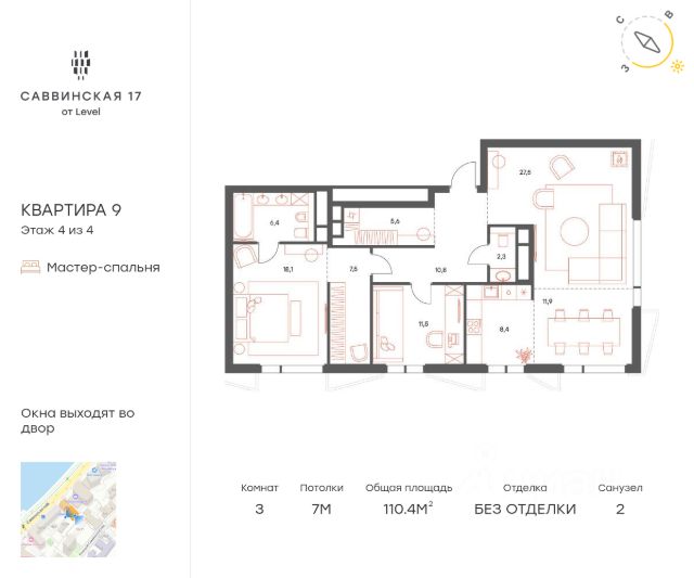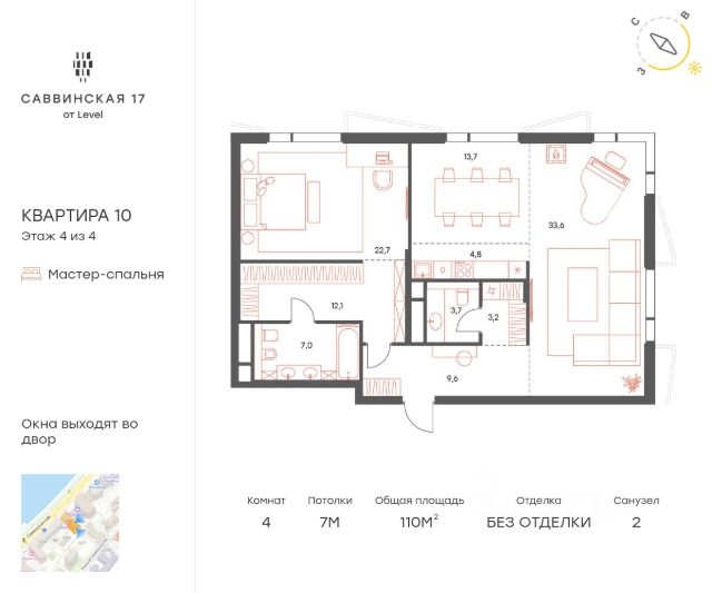 В историческом районе Хамовники продается 5-к квартира площадью 134.40 кв.м, расположенная на 2 этаже клубного дома Саввинская 17 от Level. Преимущества: - всего 22 квартиры редкого формата, что формирует атмосферу элитного закрытого клуба; - высота потолков от 6,43 до 7 метров; - окна в пол, каждая квартира будет наполнена светом и солнцем; - возможность сделать второй уровень в каждой квартире и возможность установить дровяной камин в квартирах на 4-ом этаже; - механизированный подземный паркинг; - закрытый двор с детской площадкой, сенсорным садом для детей и местом для тихого отдыха взрослых. Расположение и инфраструктура: Проект расположен в самом сердце Москвы на Саввинской набережной. - 2 минуты до Садового кольца и 6 минут до ТТК на машине; - 20 минут пешком до станции метро "Спортивная"; - 15 минут пешком до "Лужники"; - в окружении более 15 детских садов, в том числе 9 частных; - в пешей доступности расположены 11 школ, 4 из которых входят в топ-20 школ Москвы по версии Forbes; - в окружении 5 парков, в том числе парк "Новодевичьи пруды", усадьба Трубецких, парк Горького. Отличная транспортная доступность: Еще одно преимущество резиденции - удобная транспортная доступность. Несмотря на близость к центру, дорога на автомобиле до Садового кольца займет 2 минуты, до ТТК - 6 минут. В пешей доступности (20-24 минуты пешком) находятся три станции метро: "Спортивная", "Фрунзенская" и МЦК "Лужники". Купить квартиру в готовой новостройке в районе Хамовники в Москве.