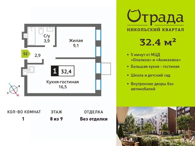 Однокомнатная квартира (евродвушка) с просторной кухней-гостиной Однокомнатная квартира (евродвушка) с просторной кухней-гостиной в жилом комплексе комфорт-класса "Никольский квартал Отрада". Планировка выполнена по современным стандартам и отличается повышенным комфортом. Квартал расположен в удачной локации, которая сочетает благоприятную экологическую обстановку с прекрасной транспортной доступностью. Проектом предусмотрены 14 корпусов высотой 6-9 этажей, а также муниципальная школа, один муниципальный и один частный детский сад, два наземных многоуровневых паркинга с кладовыми помещениями. Надежный застройщик ГК "Отрада" с высочайшим рейтингом 5 звезд от портала ЕРЗ. Все корпуса во всех ЖК сданы раньше срока!