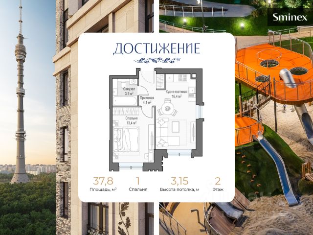 Двуспальная квартира с кухней-гостиной и настоящим дровяным камином. Окна выходят на запад, что позволит наслаждаться закатом и любоваться огнями ночного города. "Достижение" - единственный дом с торжественной архитектурой в окружении бескрайних парков на любой вкус: парк "Дубовая роща", обновленный классический парк "Останкино", самый известный парк России ВДНХ и крупнейший в Европе ботанический сад. Дом находится в непосредственной близости от центра города: до Садового кольца на автомобиле - 15 минут, 700 м до станции метро "Бутырская", а от нее всего 3 станции на метро - и вы на Цветном бульваре. Архитектура проекта - современное прочтение торжественного и изящного стиля ар-деко, который, как и сталинский ампир, сформировался в результате развития идей чикагской школы. В доме 6 секций, 115 вариантов продуманных планировочных решений - от уютных студий до просторных пентхаусов с дровяным камином. В каждой квартире предусмотрен полный комплекс систем комфорта: принудительная центральная вентиляция с фильтрацией воздуха, очистка воды до уровня питьевой, круглогодичное горячее водоснабжение, быстрые бесшумные лифты, которые идут прямо в паркинг, продуманная подготовка под кондиционирование и другие технологические решения. В доме "Достижение" общественные пространства и квартира тоже гармонично дополняют друг друга, как части единого целого. Здесь есть инфраструктурный центр Clubhouse только для жителей, открывающий возможности для общения и детского развития: клубная гостиная жителей по стандарту Friend`s Lab и детская игровая комната 250 кв.м. в концепции Kid`s Lab. На площади 1,7 гектара создан живописный парк с террасным склоном, в котором растут луговые травы, кустарники и деревья. Пространство ландшафтного парка разделено на зоны для активного и спокойного отдыха с зелёными уголками для любителей тишины. Для спокойного отдыха: тихие места с беседками и шезлонгами, клубная гостиная в концепции Friend`s Lab с открытой террасой и гамаками, зона для барбекю, смотровая галерея, уютный пруд, а также пять пеших маршрутов для променада. Для активного отдыха: универсальная многофункциональная спортивная площадка, отдельная зона для занятий workout и бесплатный фитнес-зал только для жителей по стандарту Fit Lab. В центральной части парка расположен амфитеатр со сценой для представлений и проведения мероприятий. Для гармоничного развития маленьких жителей - пространства по стандарту Kid`s Lab для гармоничного развития детей всех возрастов: детская площадка, игровая комната, рельефная площадка для общения со сверстниками, где можно заниматься паркуром, танцевать и играть в настольный теннис.