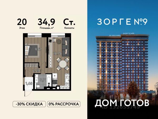 "Зорге 9" — готовые апартаменты бизнес-класса на Ходынке. 10 минут до Москва-Сити. Архитектура: 3 современных корпуса с фасадами в стиле архитектуры Нью-Йорка и с сервисами премиальных отелей, высотой до 23 этажа. Строгие линии, панорамные окна создают ощущение неподдельной роскоши и комфортной жизни в сердце мегаполиса. Проект награжден авторитетной премией European Property Awards. Резиденции: Свободная планировка, небольшая глубина этажа, огромные панорамные окна в пол до 3,6 м и высота потолков до от 3,3 до 4,3 м позволяют реализовать самые смелые концептуальные идеи и создать идеальный интерьер с учетом всех пожеланий. Вдохновляющие виды на город украсят ваш апартамент лучше любой картины. Есть возможность приобретения дизайн-проекта и полной меблировки апартаментов от партнеров девелопера. Расположение: 3 мин. пешком до парка Березовая роща 10 мин. пешком до Ходынского поля 10 мин. до ТЦ Авиапарк 30 минут до Шереметьево 10 мин до Москва-Сити или 1 станция до Москва-Сити 5 минут до ТТК 4 станции метро в шаговой доступности: 6 мин м. Полежаевская (фиолетовая ветка) 7 мин МЦК Зорге (МЦК) 7 мин м. Хорошевская (голубая ветка) 10 мин МЦК Хорошёво (МЦК) Благоустройство: Собственный парк 2 га с амфитеатром и поющими фонтанами. В парке высажено 136 деревьев и более 11 000 кустов и мелких растений из немецких питомников. Площадка для йоги и воркаут-зона со спортивными площадками. Теннисные столы и детский плейхаб Две башни Авторское гранд-лобби В лобби предусмотрена лаундж-зона, чайная с камином, комната для хранения велосипедов и колясок. Доступ по системе FACE ID. В отделке лобби и лифтовых холлов использован декоративный камень итальянского бренда Atlas Concorde Пентхаусы На верхнем уровне комплекса расположены роскошные просторные пентхаусы с высотой потолка до 4,2 метра и панорамными окнами до 3,6 метров, открывающими великолепные виды на столицу. Пентхаусы с выходами на собственные приватные террасы на кровле, площадью от 150 кв. м являются жильем high-уровня, демонстрирующим высокий статус владельца.