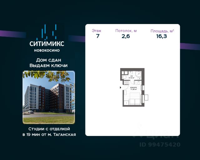 Продаётся уютная студия-апартаменты в 9-ти этажном комплексе, общей площадью 22,1 кв.м., на 7 этаже. Апартаменты с чистовой отделкой "под ключ" и большими окнами. В некоторых лотах предусмотрен Эркер много света и очень красиво. Архитектурный облик комплекса выполнен в современном стиле, на огороженной территории благоустройство, зоны отдыха и детские площадки. На первых этажах вы найдете кофейни и рестораны, продуктовые магазины, центры бытовых услуг, аптеки и другие объекты необходимого сервиса. А современные лобби с витражным остеклением и дизайнерской отделкой порадуют жителей дневным светом и воздухом. Менее чем за 1 минуту пешком можно добраться до таких объектов, как: Ледовый дворец, Спортивный комплекс Косино и Клуб водных видов спорта Acquatica. Рядом с комплексом расположены: детские сады, множество школ, стоматология, центр развития ребенка, магазины, кафе и отделения банков. Район отличается хорошей экологией: озера Черное и Белое, а также Салтыковский лесопарк площадью 1012 га. Рядом с озёрами находится Косинский пляж с широкой чистой прибрежной полосой, песчаным берегом и зоной для игр в волейбол. МФК "СИТИМИКС Новокосино" находится в 15 минутах пешком от м. Новокосино, время поездки до центра Москвы займёт всего 30 минут. Дом сдан. Выдаём ключи. Застройщиком квартала выступает компания APSIS GLOBE, основанная в 2008 году. В качестве девелопера компания успешно завершила ряд инфраструктурных, коммерческих объектов на территории Московской области, Москвы, Санкт-Петербурга. В портфолио застройщика школа, детский сад, жилые и многофункциональные комплексы, комплексная застройка микрорайонов.