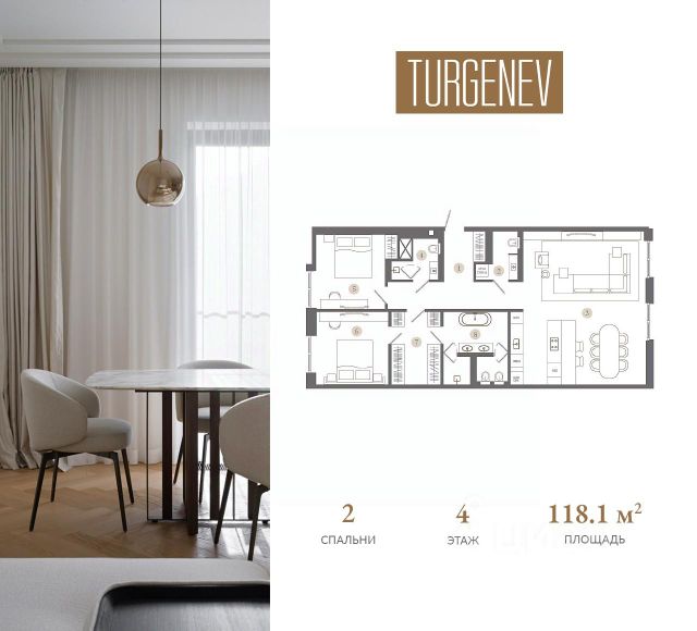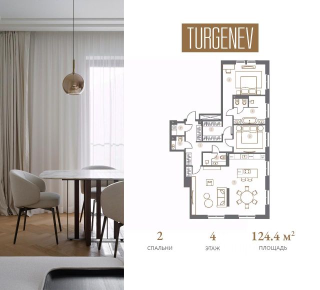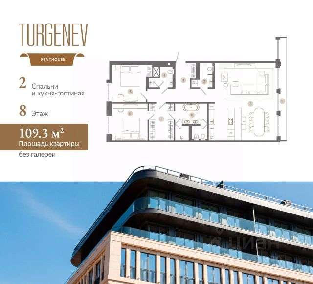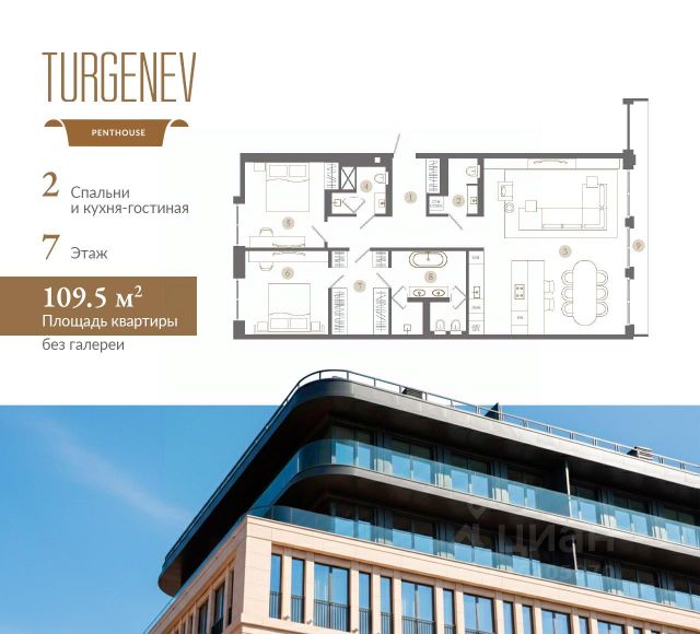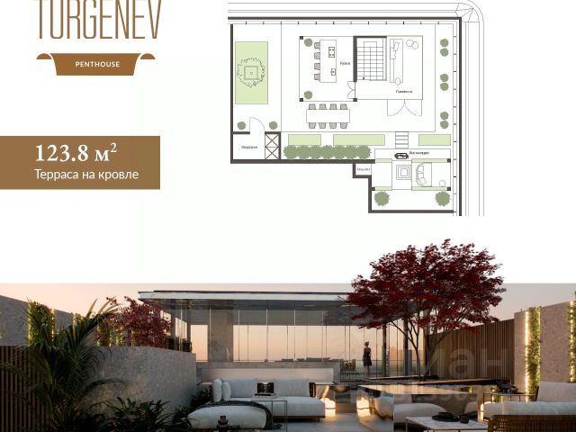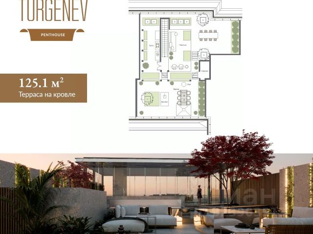 Самый просторный пентхаус в доме: площадь с учетом террасы - 527 м2, 3 спальни, 8 этаж Клубного дома TURGENEV. Особенности: Большая площадь, собственная просторная терраса на кровле, 2 открытые галереи, зенитные фонари (для естественного освещения через кровлю), премиальная финишная отделка, 2 дровяных камина (в гостиной и в одной из спален), 2 входа в квартиру, кухня для персонала. Описание: Главный вход в пентхаус ведет в прихожую-холл (17,03 м2), второй - в зону столовой (40,30 м2) и дополнительной кухни для персонала (5,47 м2). Панорамные окна просторной столовой, кабинета (19,45 м2) и гостиной с дровяным камином (63,33 м2) выходят на юго-запад, на тихий переулок Малый Головин. Панорамные окна двух спален (24,83 м2 и 31,73 м2) выходят на запад. Вдоль столовой, кабинета, гостиной и двух спален протянулась открытая галерея (13,06 м2). На галерее можно организовать зону для отдыха (столик, кресла), где приятно проводить время с чашечкой кофе и любоваться Москвой. Панорамные окна третьей спальни (33,47 м2) с собственной открытой галереей (1,78 м2) выходят на восточную сторону - во внутренний двор-сад с фонтаном и водными каналами. В этой спальне также установлен дровяной камин. При каждой комнате предусмотрены места для хранения, во второй спальне также есть гардеробная (5,66 м2). Помимо ванной комнаты (8,57 м2), в квартире расположено два санузла с душем, гостевой санузел и постирочная. Дом сдан. Клубный дом TURGENEV (Тургенев) расположен в ЦАО Москвы в районе Чистых прудов, в тихом месте на Костянском переулке между Садовым и Бульварным кольцом, в 3 км от Красной площади Кремля. Рядом большое количество достопримечательностей, музеев, театров, ресторанов, баров, торговых центров. Архитектурный проект дома разработан при участии международной команды архитекторов: Squire&Partners из Британии и Building Design Architectuur из Нидерландов. Фасад - натуральный камень: первые 6 этажей - португальский известняк, 7 и 8 этажи - гранит Dark Brown. Клубный дом TURGENEV имеет П-образную форму и состоит из 8 этажей, 5 секций и 118 квартир, включая двухуровневые пентхаусы с террасами и каминами. Все квартиры в Клубном доме TURGENEV реализуются с чистовой премиальной дизайнерской отделкой в современном стиле контемпорари от нидерландского бюро Wolterinck. В отделке квартир в TURGENEV используются экологичные, природные материалы премиального качества: пол из натуральной австрийской паркетной доски Austriawood, стены - итальянская краска PRATTA Exclusive, в санузлах - английская штукатурка Tadelakt и натуральный мрамор: итальянский Wooden White и греческий Pirgon. В каждой квартире установлены кухни от итальянского бренда Cesar со встроенной бытовой техникой премиальной линейки Smeg. Кухонный остров, столешница и фартук кухни выполнены из эксклюзивного итальянского мрамора Arabescato Grigio Orobico, одним из лучших видов мрамора на итальянском рынке натуральных отделочных камней. Внутренний двор с садом Клубного дома TURGENEV - оазис с зелеными газонам