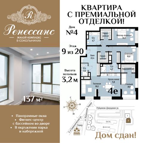Жилой комплекс премиум-класса "Ренессанс" расположен на Рубцовско-Дворцовой улице исторического района Сокольники, в неск. мин. ходьбы от знаменитого парка "Сокольники", где круглый год можно прекрасно проводить время всей семьей. Квартиры продаются с полной отделкой, что обеспечивает комфорт проживания в доме сразу после получения ключей, т.к. исключает длительный период ремонта квартир - у вас и соседей, а также сохраняет презентабельные входные группы в идеальном состоянии. Премиальная отделка квартир "под ключ" выполнена европейскими специалистами по эксклюзивным дизайн-проектам с использованием дорогих материалов: экологичное напольное покрытие - инженерная доска TRIO на хвое (материал - дуб) и керамогранит KERAMA MARAZZI с обогревом пола, стяжка пола с шумоизоляцией, современные системы кондиционирования и сантехническое оборудование премиум-класса - Villeroy Boch, Grohe, Geberit Duofix, выключатели и розетки - Berker. Высокие потолки - 3,2 м и входные двери квартир - 2,4 м со вставками из массива дуба, выполненные в едином стиле, подчеркивают премиальный статус владельцев. Из панорамных окон премиального бренда Schuco открываются завораживающие виды на сияющие в лучах солнца купола церквей и храмов, зелень легендарного парка "Сокольники" и национального парка "Лосиный остров", излучины реки Яузы с величественной гранитной набережной, старинные здания, среди которых дворец императрицы Елизаветы Петровны, небоскребы "Москва-Сити", Останкинскую телебашню и приватную, охраняемую территорию комплекса с концепцией "двор без машин", изысканным ландшафтным дизайном, богатой коллекцией растений, пространствами для отдыха с роскошным фонтаном с красивой подсветкой, элегантной перголой, большими шахматами, детскими городками и спортивными площадками. Роскошный интерьер лобби: натуральный испанский мрамор, вертикальный фонтан, репродукции картин эпохи Возрождения, великолепная итальянская люстра ручной работы с подвесками из хрусталя CutCrystal и муранского стекла, иранские ковры, дизайнерская мебель. Лифты премиум-класса ThyssenKrupp. Консьерж-сервис. На этажах мусорокамеры закрытого типа. Из квартиры можно связаться с консьержем по видеодомофону британской компании BAS-IP. Уникальная транспортная доступность: 5 мин. на авто до ТТК и Русаковской эстакады, 10 мин. - до Садового кольца и ул. Земляной Вал, 15 мин. - до Кремлевской наб. В шаговой доступности - ст. м. и БКЛ "Сокольники" и "Электрозаводская". Развитая собственная инфраструктура: подземный паркинг, здание фитнес-центра с бассейнами, объекты торговли и сферы услуг. Отличная инфраструктура респектабельного района Сокольники: детсады, элитные общеобразовательные, музыкальные и спортивные школы, ТЦ и т.д.