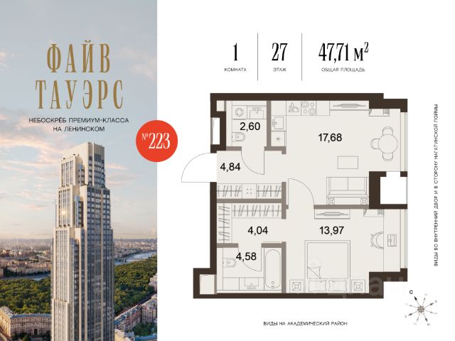 Гибкие программы рассрочки: 0% без переплат и удорожания; первый взнос от 10%. • Продуманное планировочное решение с удобным функциональным зонированием • Просторный холл с большой нишей для хранения вещей • Наличие гостевого санузла с нишей под стиральную и сушильную машины • Все комнаты, включая кухню-гостиную, изолированы друг от друга • Малая спальня с двумя панорамными окнами • Большая кухня-гостиная (более 21 кв. м) с панорамным окном • Мастер-спальня с двумя панорамными окнами и приватным санузлом О проекте ФАЙВ ТАУЭРС — первый жилой небоскрёб на Ленинском проспекте и самый высокий дом столицы за пределами делового кластера "Москва-Сити". Премиальный небоскрёб представляет собой ультрасовременное, высокотехнологичное здание, идеальный синтез стилей культовых высоток Москвы и небоскребов Нью-Йорка и поражает воображение уникальными видами, монументальной роскошью и совершенством форм. Величественная панорама, открывающаяся из окон вашей квартиры, завораживает: легендарные сталинские высотки, шпиль главного корпуса МГУ, "Москва-Сити", спорткомплекс "Лужники". Окружение 75-этажный жилой комплекс премиум-класса расположен в историческом Донском районе. Транспортная инфраструктура проекта сделает жизнь резидентов ФАЙВ ТАУЭРС комфортной и продуманной: удобные выезды на ТТК и Садовое кольцо, 10 минут до метро "Ленинский проспект", 11 минут на МЦК до Москва-Сити. Рядом расположены крупные деловые и бизнес-центры, а в шаговой доступности — 500 га парков, образуемых Музеоном, Парком Горького и парком "Воробьевы горы". Инфраструктура Архитектурное бюро Олега Клодта разработало дизайн общественных пространств ФАЙВ ТАУЭРС: гранд-лобби, камерную библиотеку c камином и лифтовую зону. Все необходимые сервисы сосредоточены на первых этажах небоскрёба: кафе, винотека, салон красоты, фитнес и детский клуб. Приватный Sky Club 49 — респектабельный лаундж с открытой террасой и ограниченным доступом на 49 этаже — только для резидентов. Квартиры в ФАЙВ ТАУЭРС Все квартиры в ФАЙВ ТАУЭРС будут сданы с предчистовой отделкой (white box). Это позволит будущим резидентам комплекса сосредоточиться на творческой части ремонта, не связанной с организацией черновых работ. В жилом небоскребе ФАЙВ ТАУЭРС запланировано 596 премиальных квартир и 87 типов планировочных решений, которые можно адаптировать под личные запросы и сценарии проживания. В комплексе премиум-класса представлены не только двух- и трехкомнатные квартиры с угловым остеклением, но и однокомнатные с видом на две стороны и трехкомнатные квартиры с видами на три стороны, что является редким предложением на рынке недвижимости. Купить квартиру в ипотеку в новостройке в районе Донской в Москве.