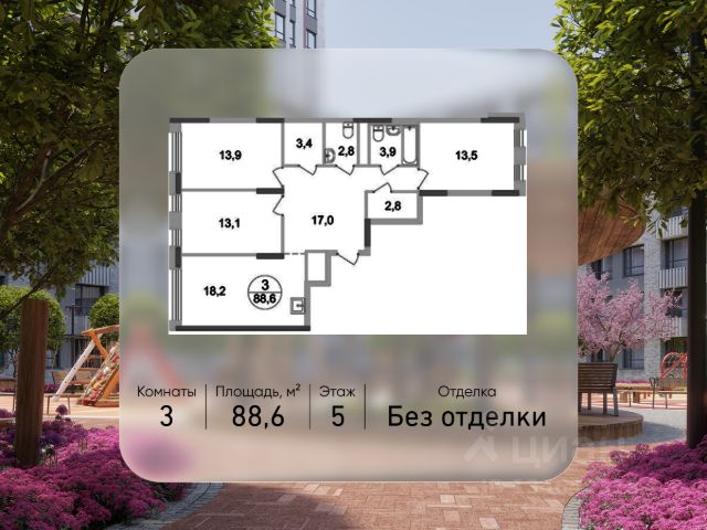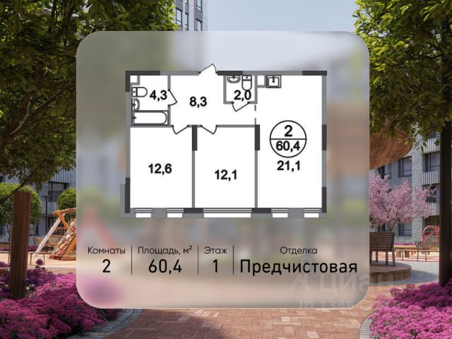 Общая площадь квартиры - 42,2 кв. м, этаж 1 из 17.