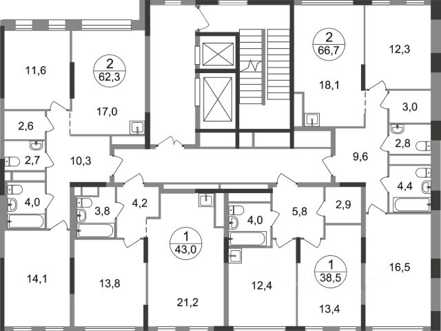- в секциях 2-4, 6-7, 11-12 по 2 лифта: 1 пассажирский, 1 грузовой